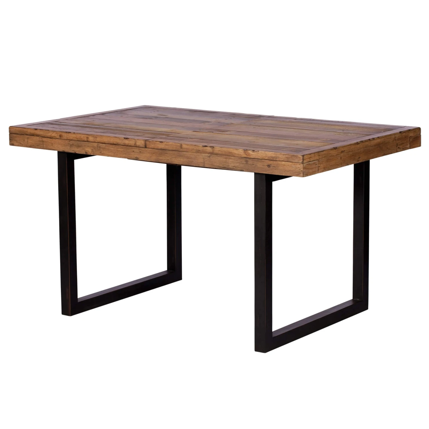 Made from reclaimed materials with a dark wood table top and topped off with a water base sealer, beautifully resting on two black U shaped legs.