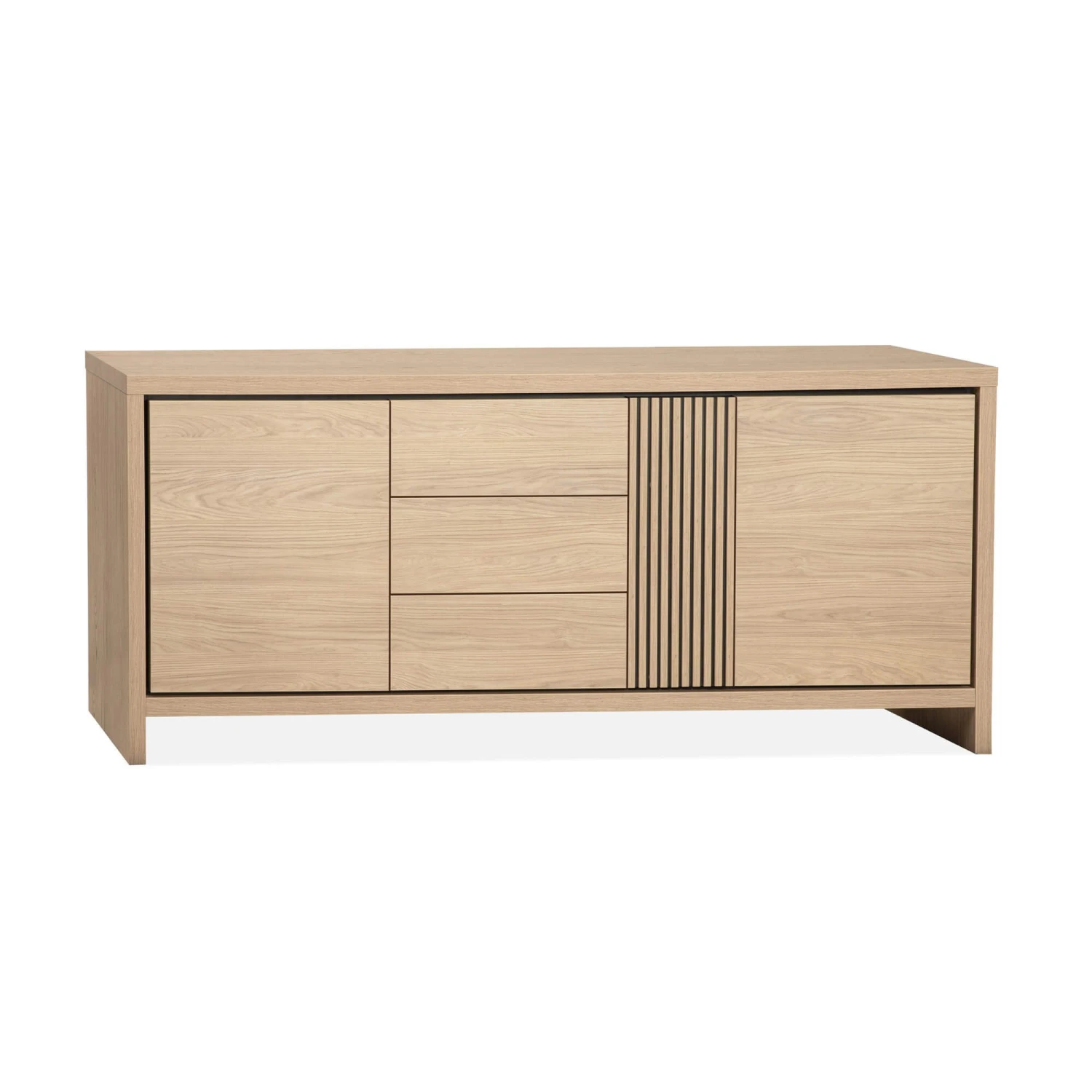 Designed with modern living in mind, the Mariana 205cm Light Oak Sideboard boasts soft close doors and a convenient push to open mechanism, ensuring effortless access and a sleek, handle-free appearance. The offset vertical slatted detailing, positioned elegantly between the drawers and door, adds a distinctive architectural touch. With sides that extend down to lift the sideboard, this oak effect sideboard achieves a light, floating look while maintaining robust stability. The Mariana 205cm Light Oak Sideboard is the perfect blend of style and function, making it a standout piece for those seeking for a sophisticated oak effect sideboard for their home.
