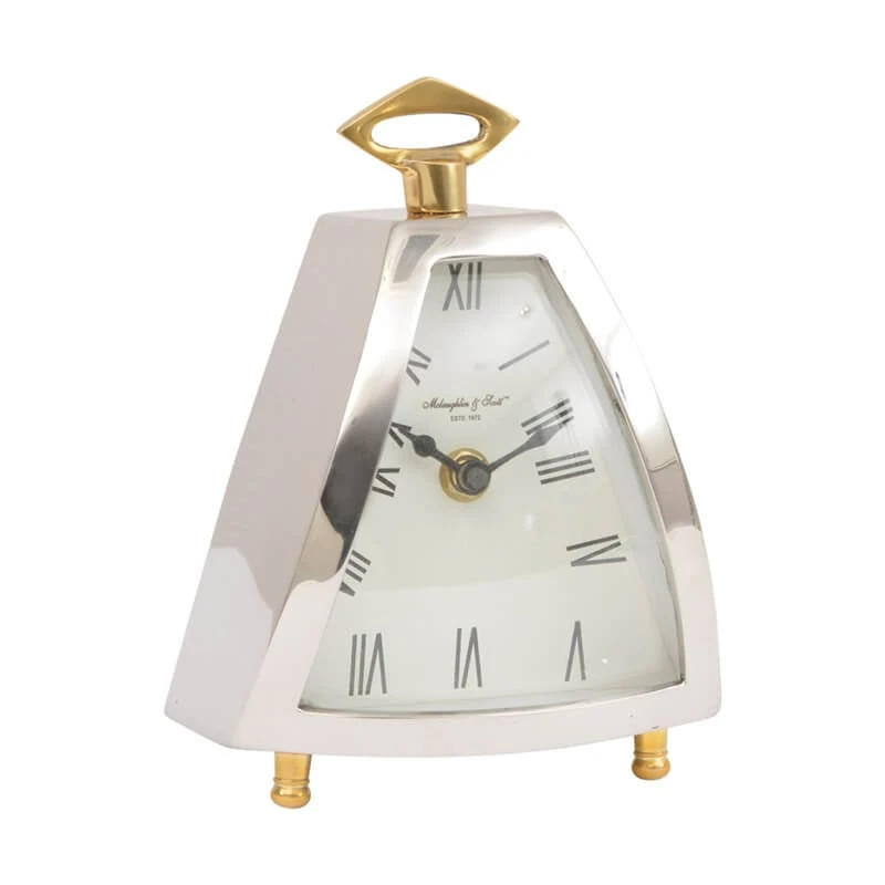 Add a contemporary look to your home with this medium sized stylish polished nickel mantel clock. The medium Isosceles Mantel Clock has a unique curved triangular shape and is finished with brass feet and bracket and a small brass handle. With a roman numeral face, this eye catching piece would fit perfectly with a modern interior. At 20cm tall, this chic mantel clock would make a statement piece that is ideal for displaying in a lounge or study.