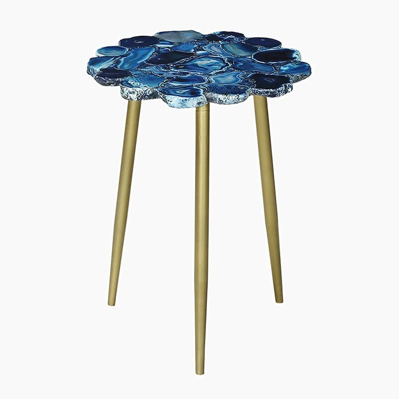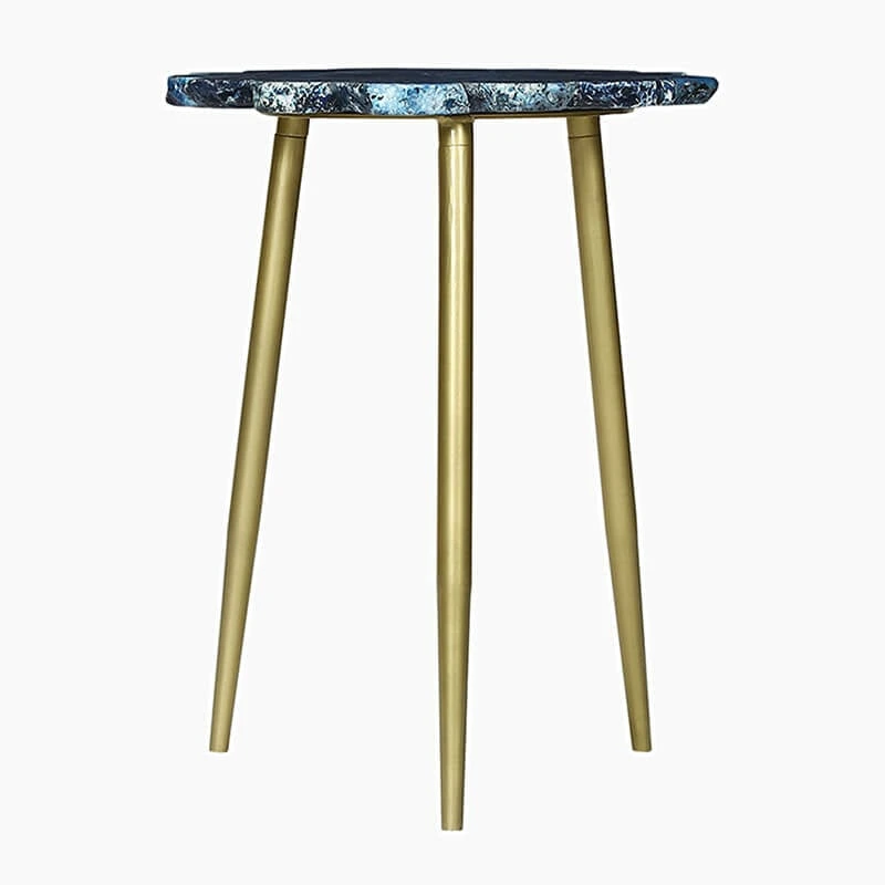 Bring in a natural touch to your living space with this sleek agate end table. The table top is crafted with beautiful segments of blue agate quartz stone that create a unique piece with a raw edge making each piece is unique to your home offering an extra space for displaying your favourite accessories. Resting on 3 sleek metal gold coated legs for a luxurious finish.