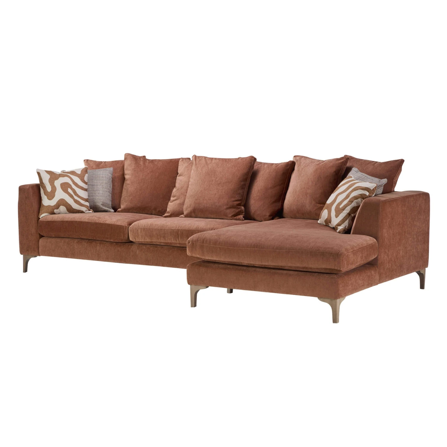 The Miranda Dusky Apricot Fabric Large Right Hand Pillow Back Chaise Sofa invites you to sit back and relax in sumptuous style. Upholstered in a dusky apricot fabric, the Miranda features clean cut lines, sleek tufting on the back cushions, a pillow back design made up of seven cushions and weathered oak wooden feet, creating a stylish and sophisticated piece.