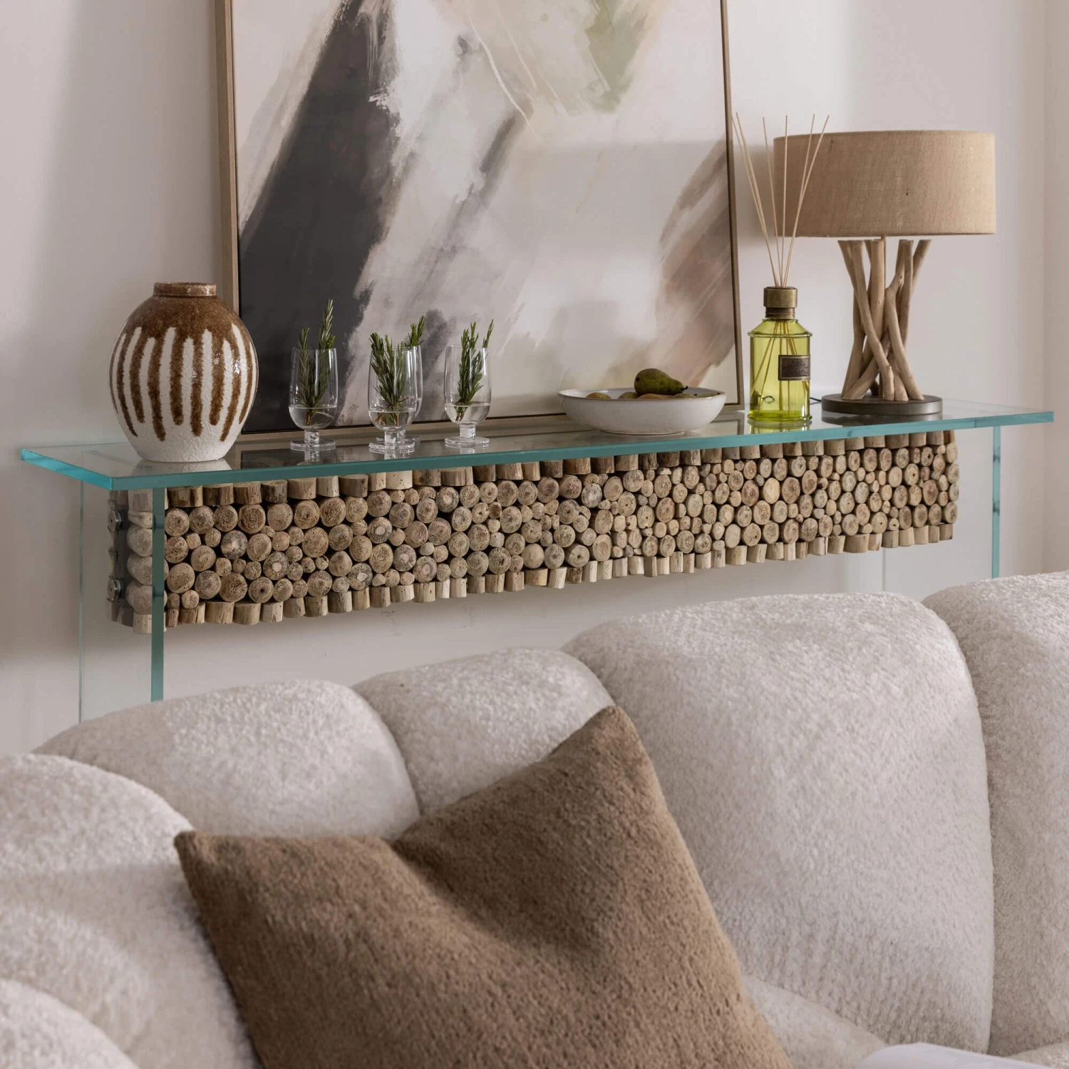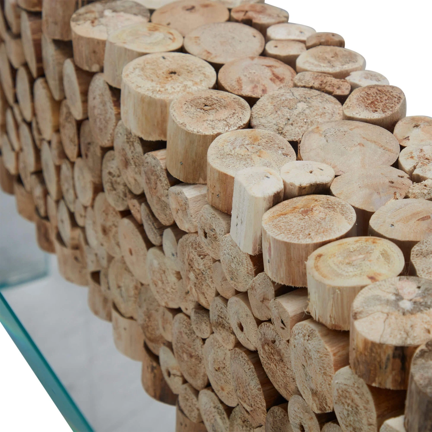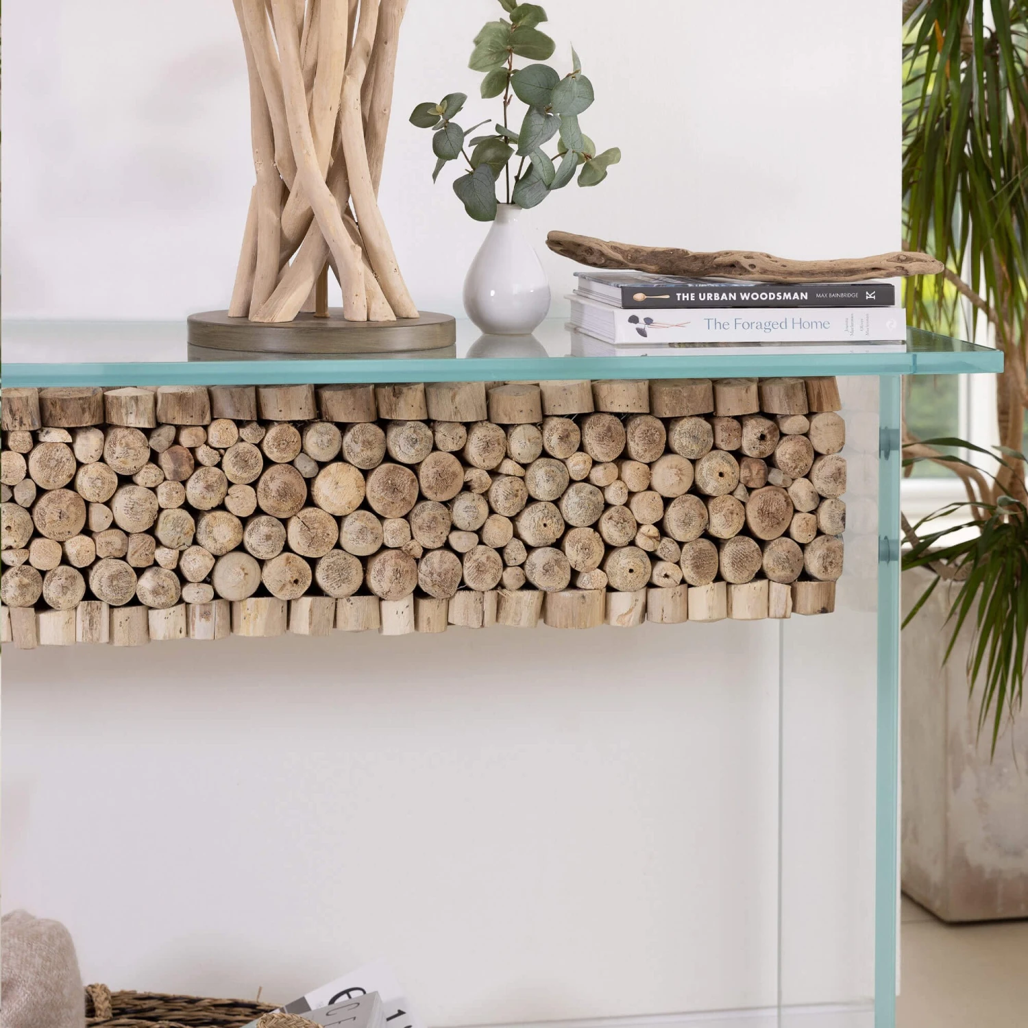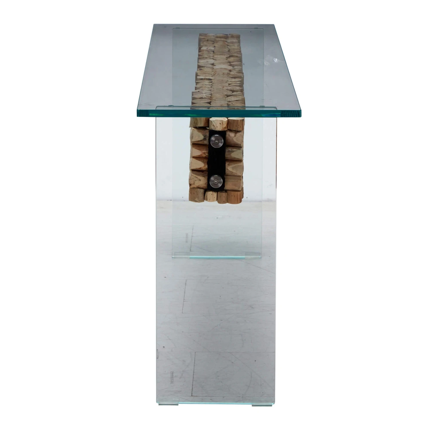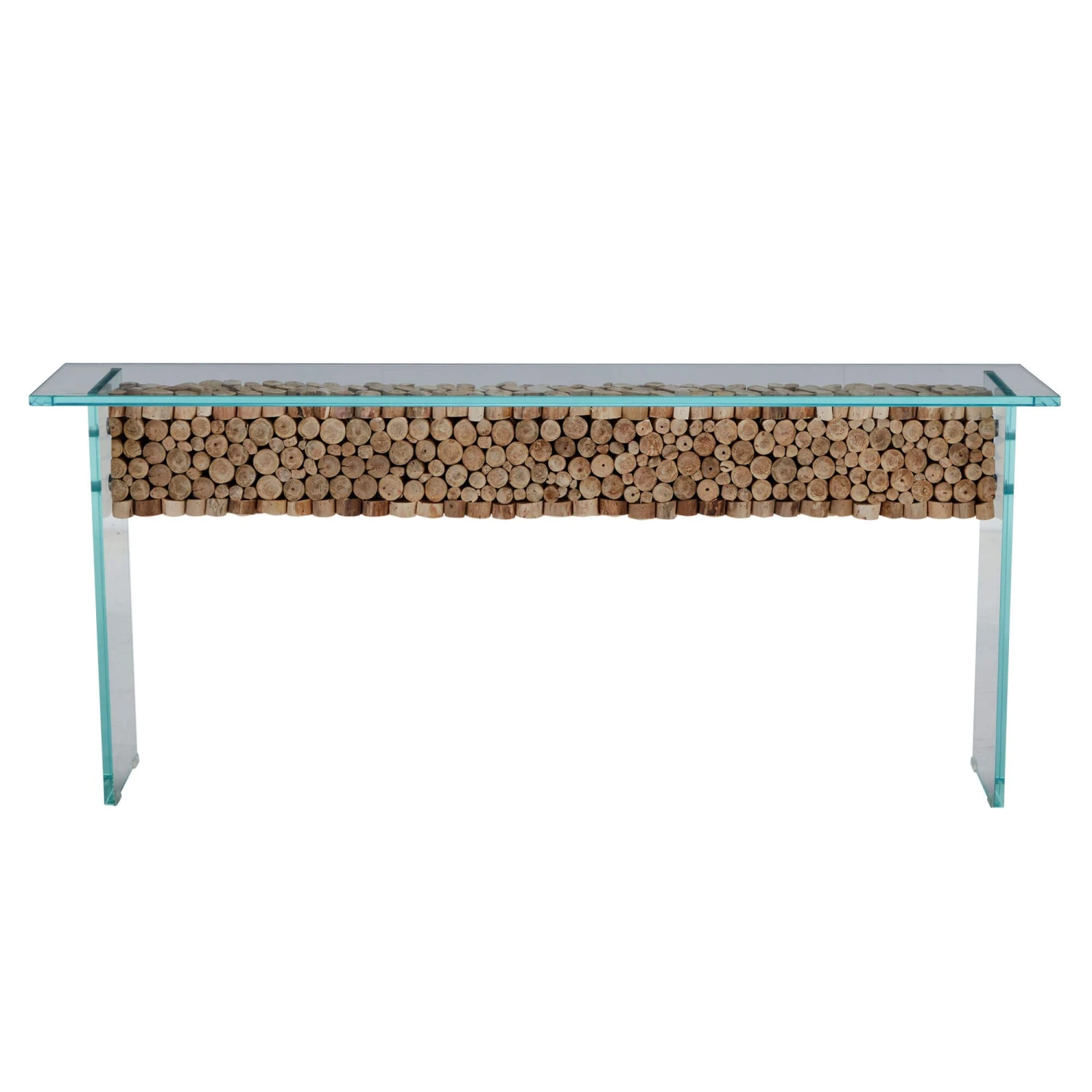 A stunning rectangular console table made of glass which features a stunning wooden centrepiece that runs through the middle of the unit. The glass allows the wooden feature to be the centre of attention, showcasing the cylindrical pieces of wood that create a textured and visually appealing feature. The glass creates the sense of lightness, with it having a soft blue hue, it brings a feeling of serenity and coolness to the unit and your space.