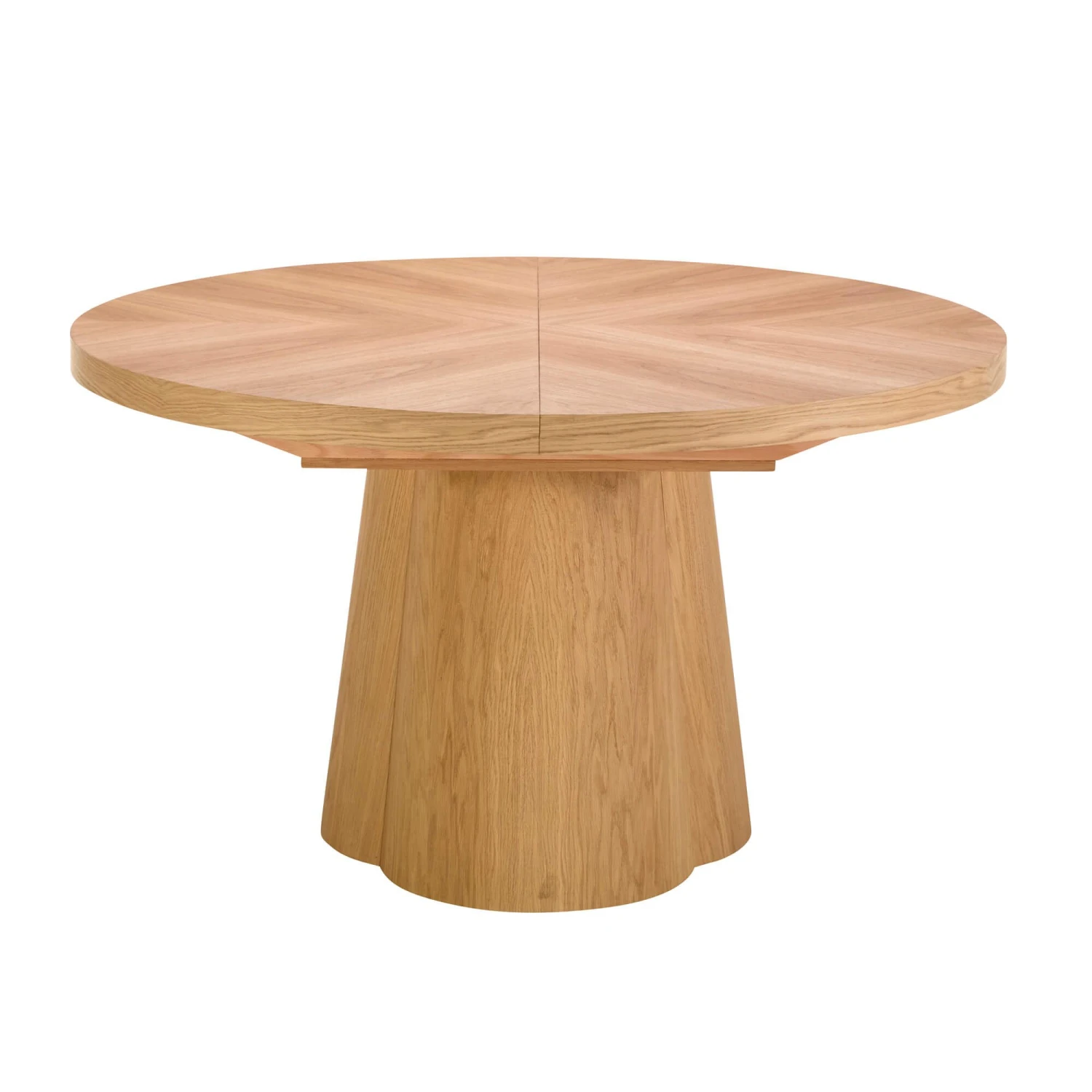 Designed with practicality in mind, the table extends smoothly to accommodate larger gatherings. The pulling rail extends from both sides, revealing a middle section that pulls out to transform the round top into an oval shape, providing extra space without compromising style. This thoughtful design and warm oak tones make the Nimbus Round Extending Dining Table a versatile and inviting addition to any dining space.