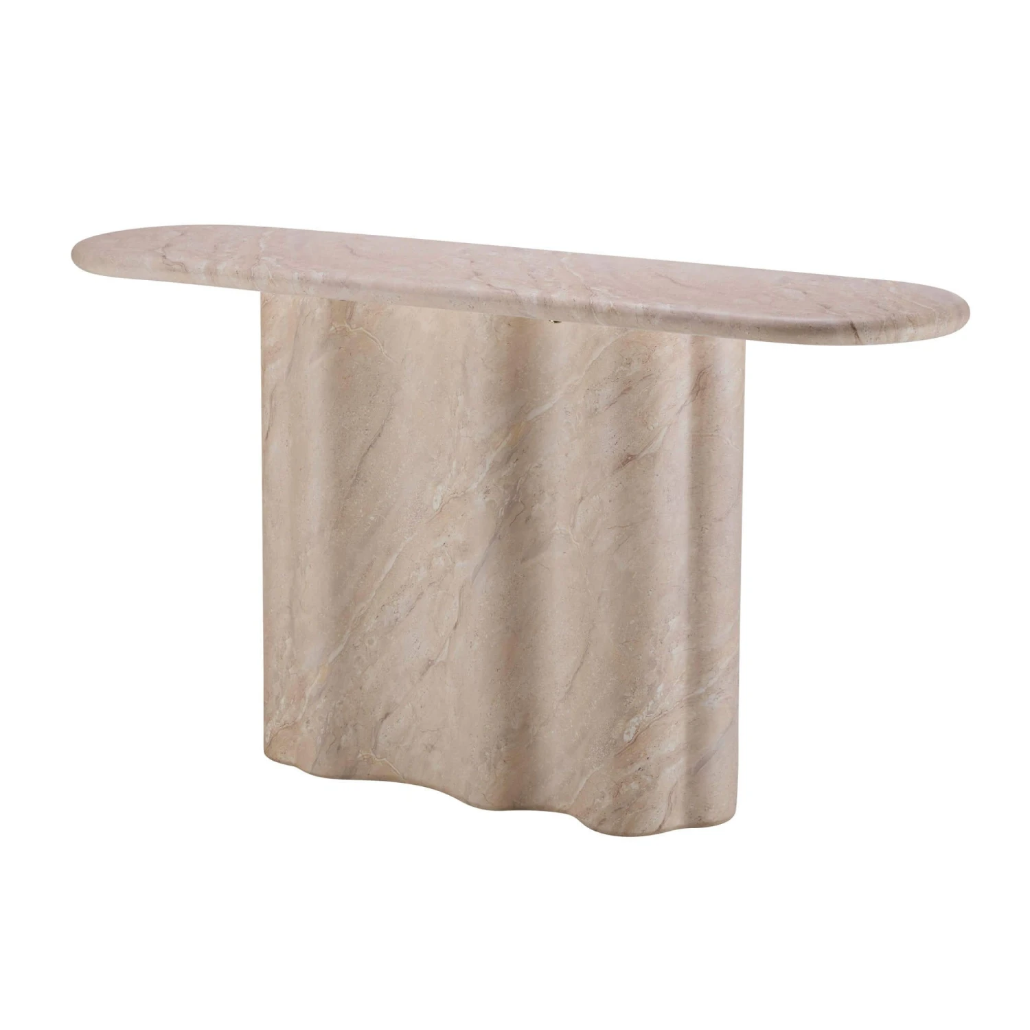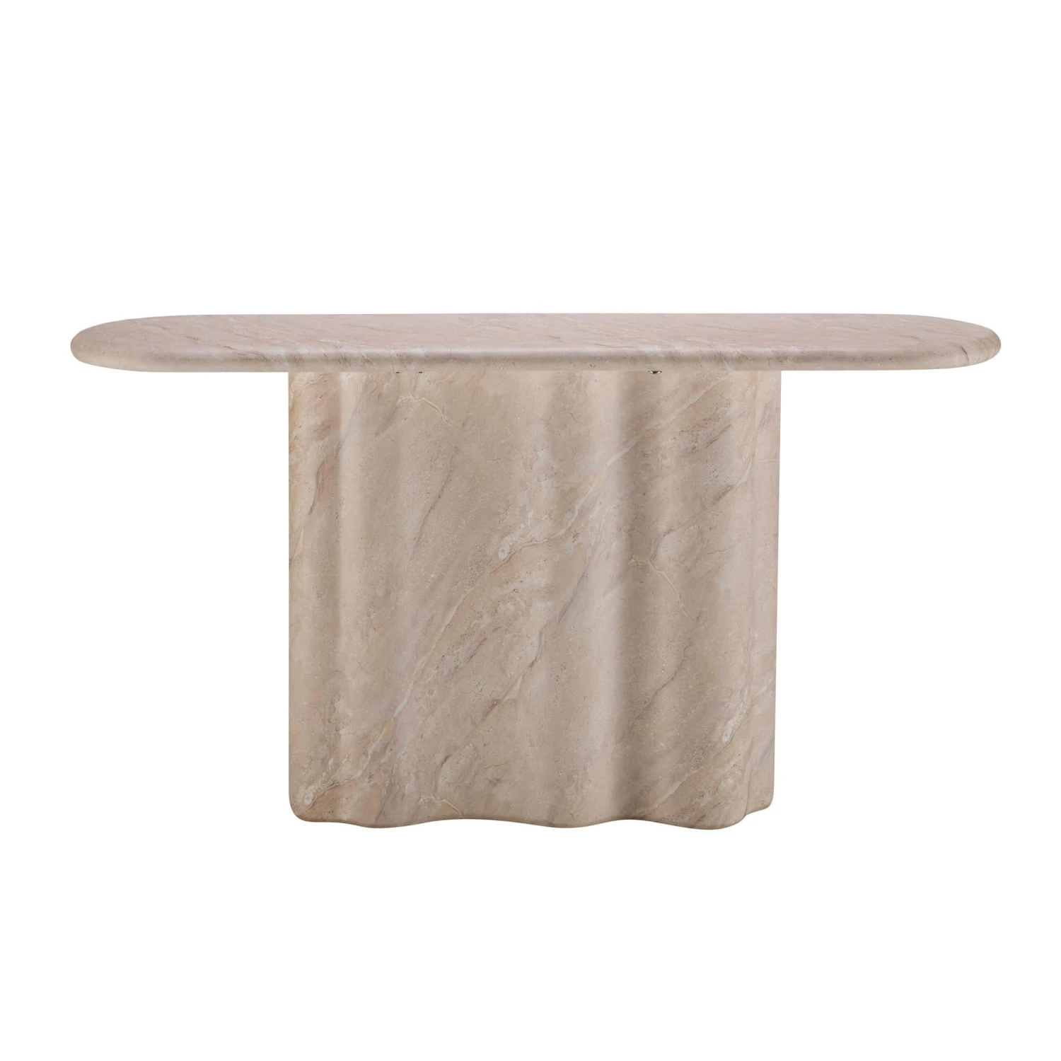 Echoing the beauty of natural stone, this console table is crafted from sturdy concrete and finished with a sophisticated travertine effect, showcasing a delicate striated pattern reminiscent of artisan stonework. The round-edged, elongated top sits gracefully above a striking wavy-shaped base, lending both drama and softness to hallways and living areas alike. At 150cm in length, this piece offers generous surface space for displaying art, cherished objects or ambient lighting.