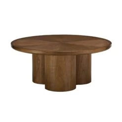 A short Elm Wood coffee table featuring a striking base that is made up of a cluster of three cylinders adding a distinct character to the table. The table top features a curved edge table top that adds charm and compliments the cylindrical legs adding an organic, smooth shape. The table has a subtle raised lip that adds further charm to the table.