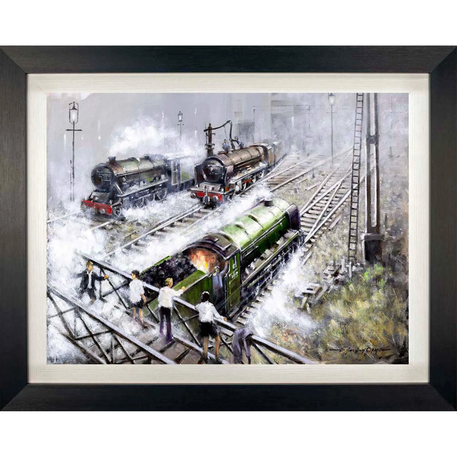 This On The Monkey Bridge Longsight Picture will add a classic feel to your room. The picture features a group of people stood on a railway bridge looking over onto the tracks with passing steam trains. This image is extremely detailed and features a range of different colours. The picture is perfect for handing above a cabinet or by itself as a feature piece.