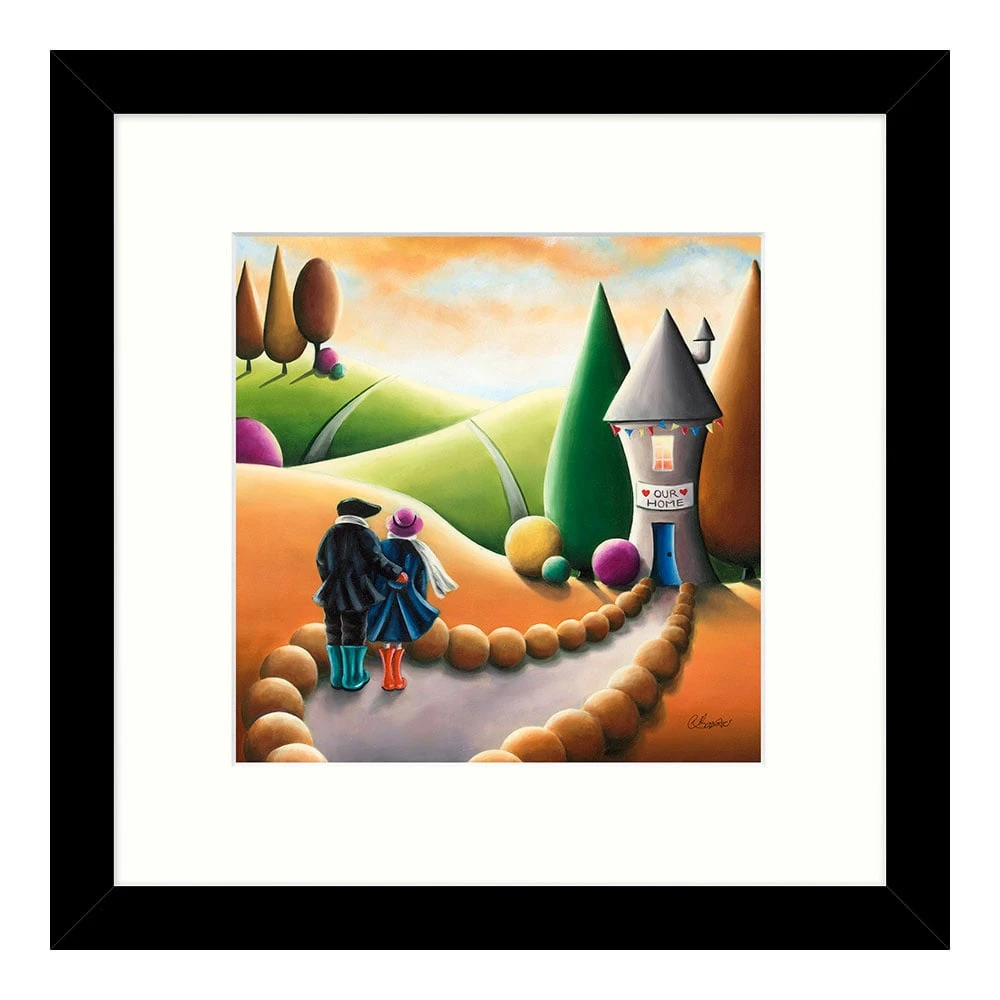 Create a striking focal point and bring colour to your home with this beautiful painting by artist Claire Baxter, featuring lovable characters George and Daphne who live in a wonderful world of bright colours and bubble trees. This captivating artwork features the pair standing on a path, admiring their home. The picture brings a personal touch to your decor through the story portrayed, as the characters in the painting explore their quirky surroundings and express their love for each other
