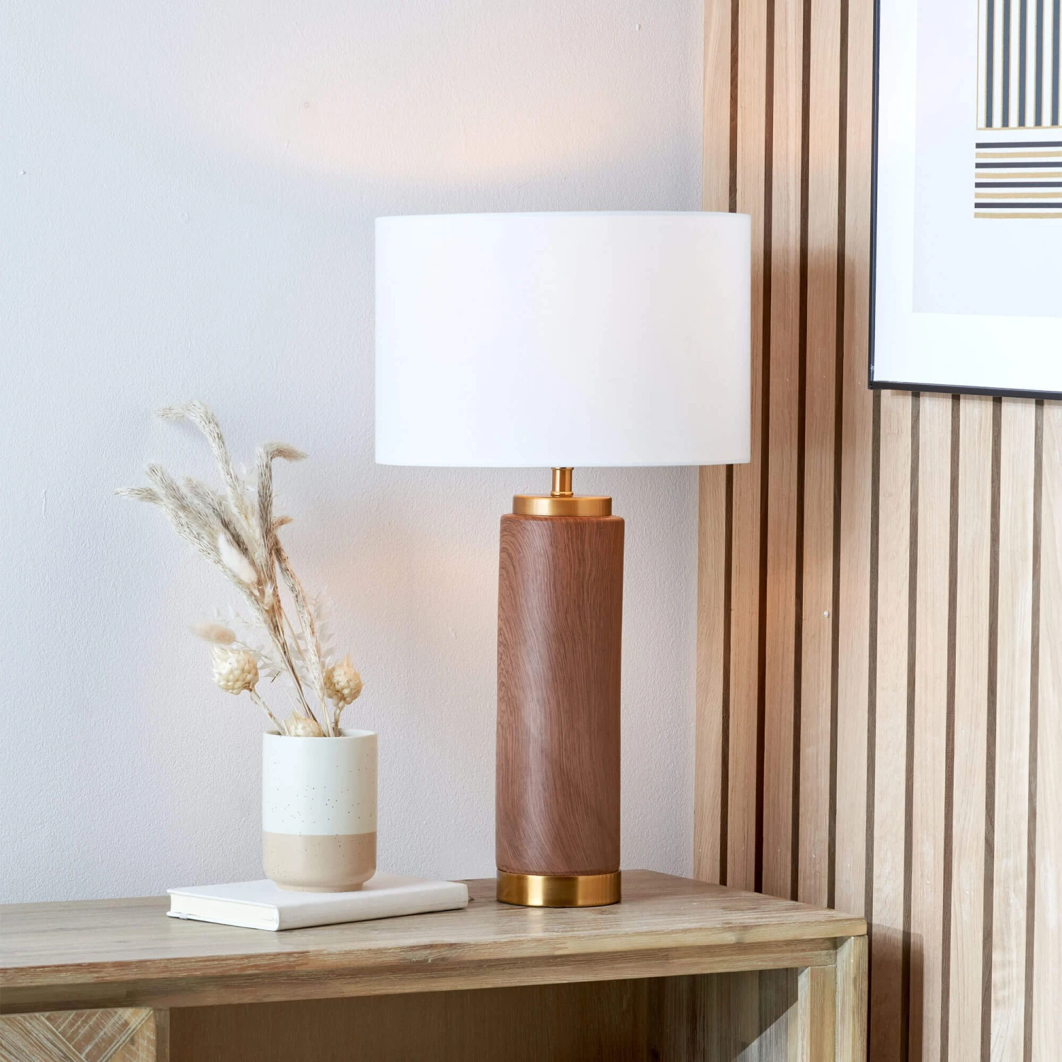 Add a natural and modern touch to your home with this Carrara Tall Wood Effect Ceramic Table Lamp With White Shade. Illuminable by an E27 LED bulb, this charming table lamp features a white faux cotton lined shade and a dark wood effect finish ceramic body complemented by gold metal detailing, providing a soft and inviting ambience. Available in two sizes, this stylish table lamp is perfect for offering a contemporary look to any interior, making it ideal for fitting in with most décor styles with its beautiful finish.