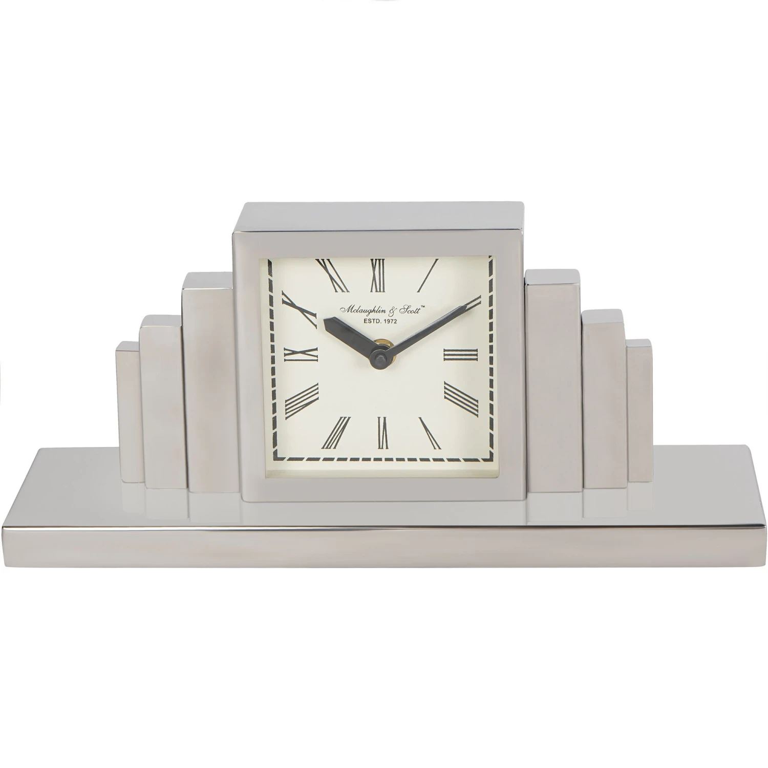 The Plaza Nickel Mantel Clock features a sleek Art Deco design adding a touch of sophistication to your room. The Clock effortlessly complements both modern and traditional decor styles, making it perfect for any home.