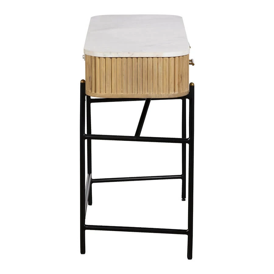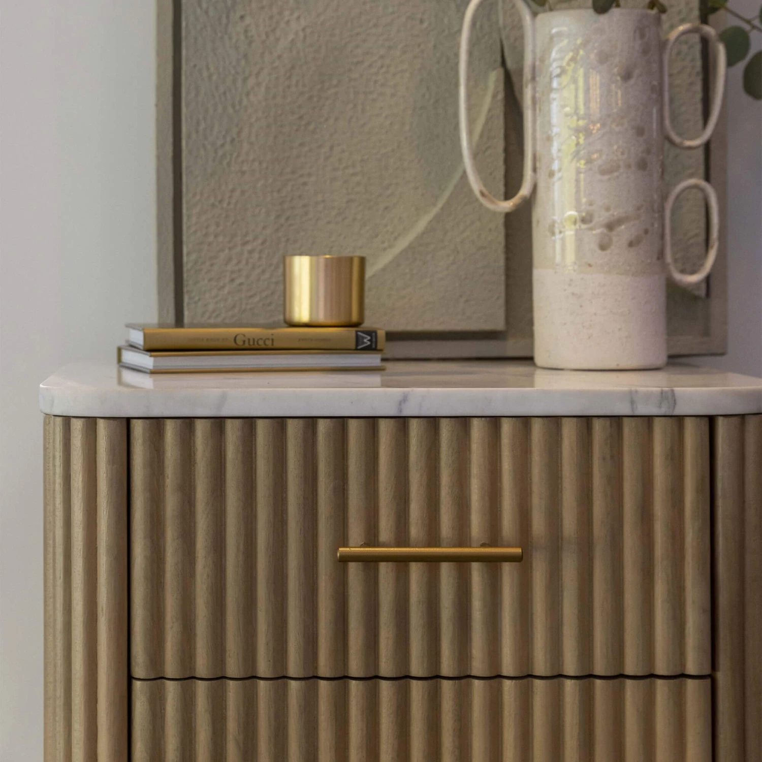Defined by a remarkable reeded carcass, crafted from a stunning, natural mango wood with a white wash finish, the Rochelle has a certain charm that is sure to enhance its surroundings. The soft, rounded edges and outline lend this sideboard an almost light and airy quality, whilst the polished finish of the refreshing white marble top further adds to the allure of this piece.
