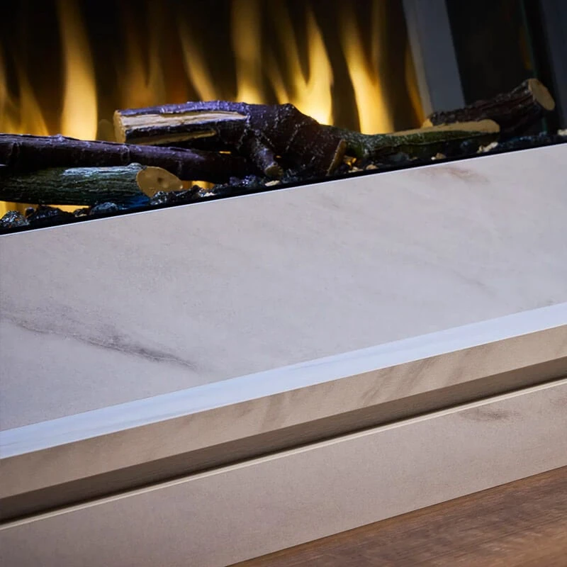 This contemporary, low-level electric fireplace suite is specifically designed to work with your TV, allowing it to be placed at a comfortable eye level directly above the suite. The expansive, landscape design and authentic large log fuel bed creates a stunning visual centrepiece. The realistic live flames can be customised with three colour options and four mood settings, ensuring you can create the perfect ambiance for any occasion.