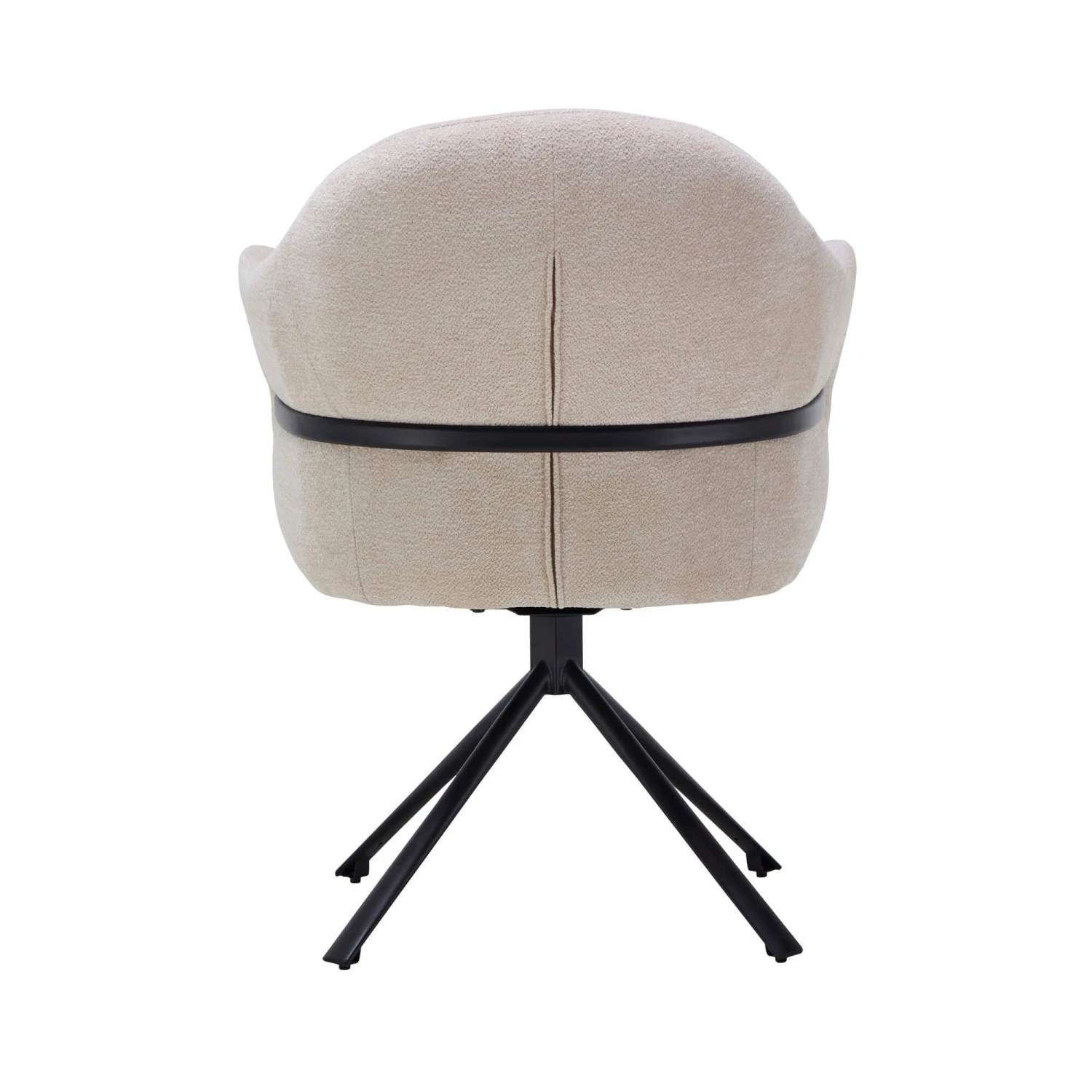 The Faith Beige Fabric Swivel Dining Chair features distinctive cylindrical legs that gracefully flatten outwards at the bottom, meeting elegantly at the centre to create a striking visual appeal. The chair’s sophisticated silhouette is enhanced by a black band at the back of the seat, seamlessly matching the base and providing a snug, tight hold. This black band contrasts the fabric, adding charm to the overall design. The generously sized seat cushion extends slightly beyond the shell of the dining chair, offering an inviting and luxurious seating experience.
