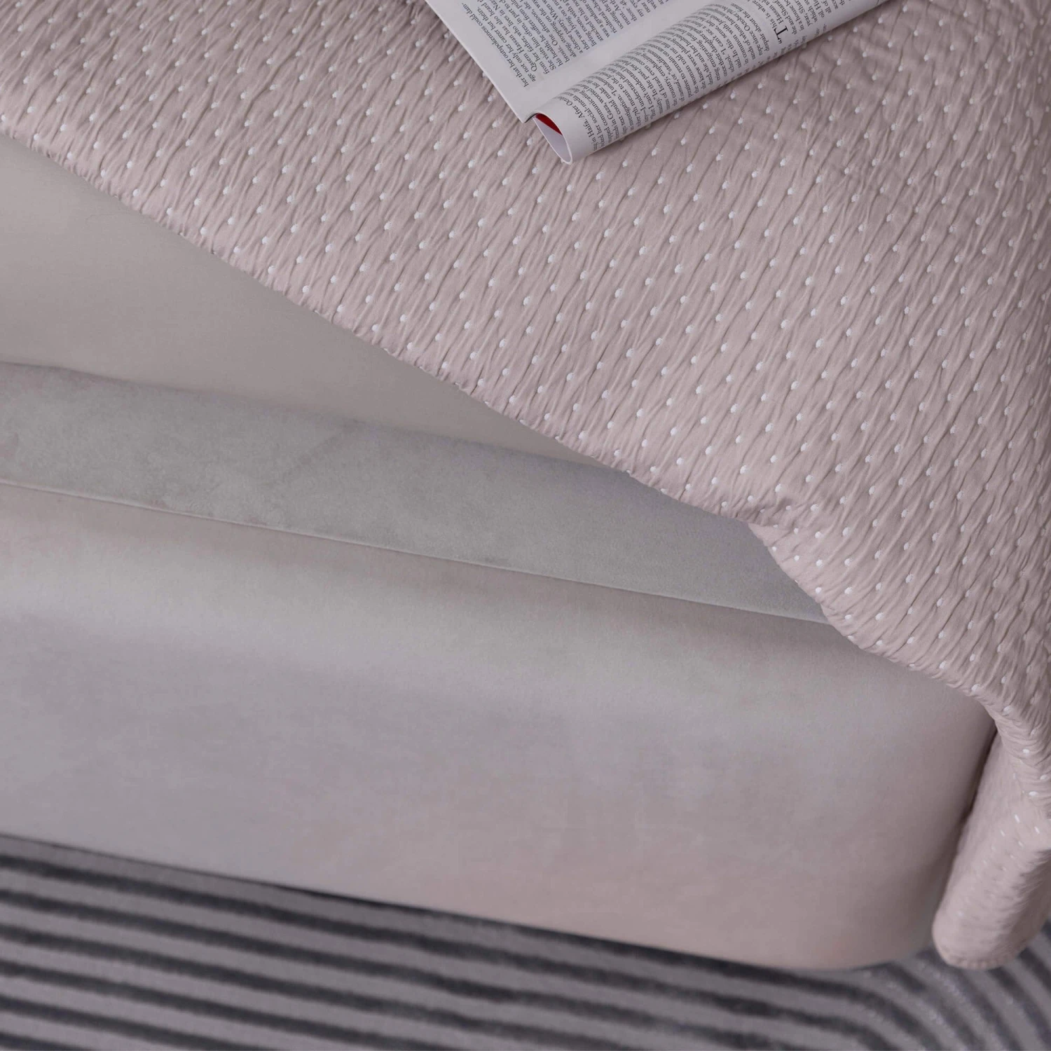 This stunning bed frame features a tall, hotel height headboard that extends beyond the width of the frame creating a grand focal point in your bedroom. The plush, thick headboard is composed of two panels, each with vertical tufting adding a layer of texture and elegance. The entirely upholstered frame and footboard, finished in a soft, plush velvet, exude a sense of opulence and comfort transforming your bedroom into a serene retreat.