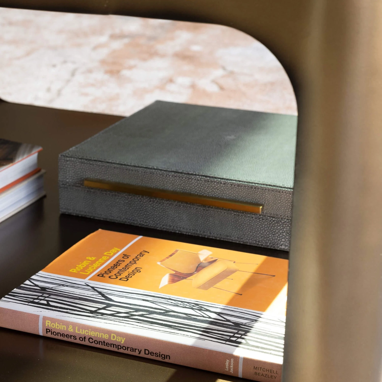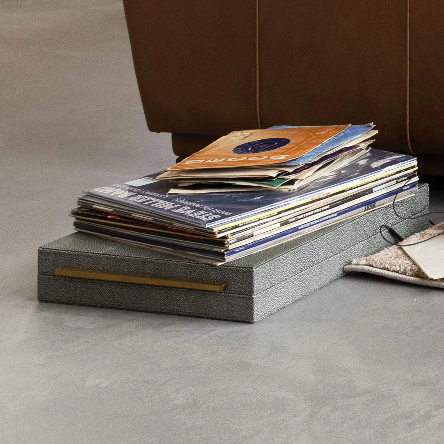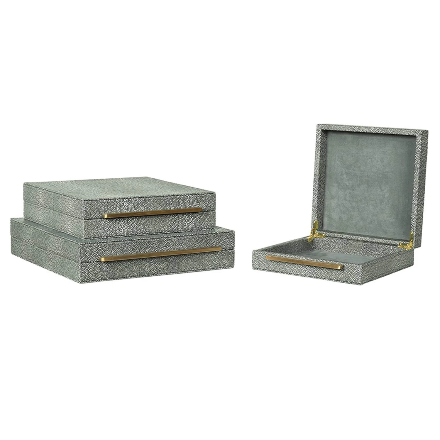 3 Simple stackable storage boxes, each in a wonderful soft green tone with a faux shagreen material finish. The boxes each have complemented rounded gold handles that add a contemporary, elegant touch. Each box has character, they create a visually appealing display when stacked.