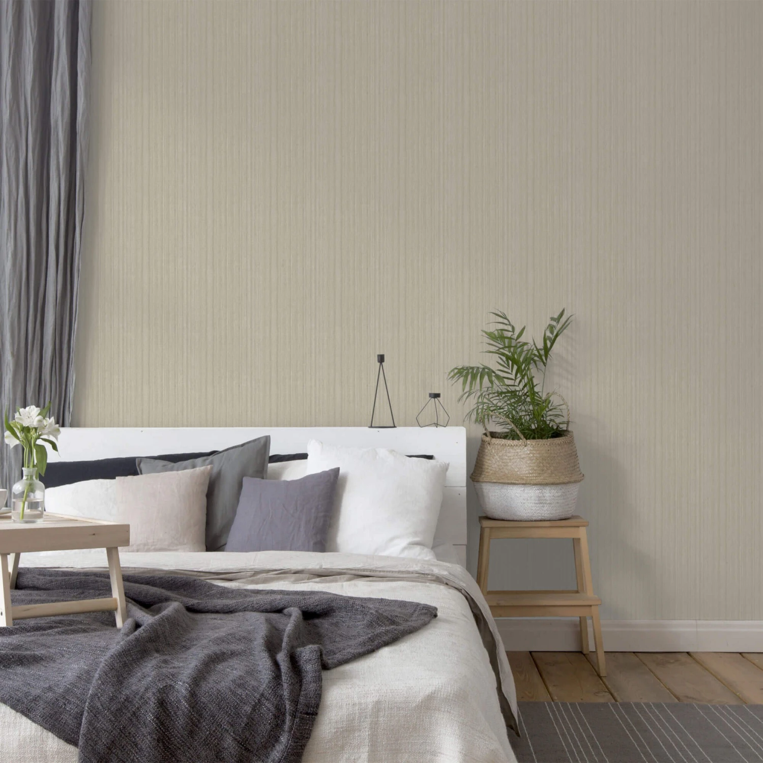 The Silk Cascade Latte Wallpaper from Arthouse brings contemporary stye and minimalist design to any living space. Featuring a subtle, vertical brushed effect reminiscent of the movement of flowing silk in an inviting latte colour on a heavyweight vinyl, this sophisticated wallpaper is perfect for adding a touch of luxury and warmth to your walls. The soft and neutral tone creates a cosy yet refined statement in any room, able to adapt beautifully to various interior settings, from rustic to modern.