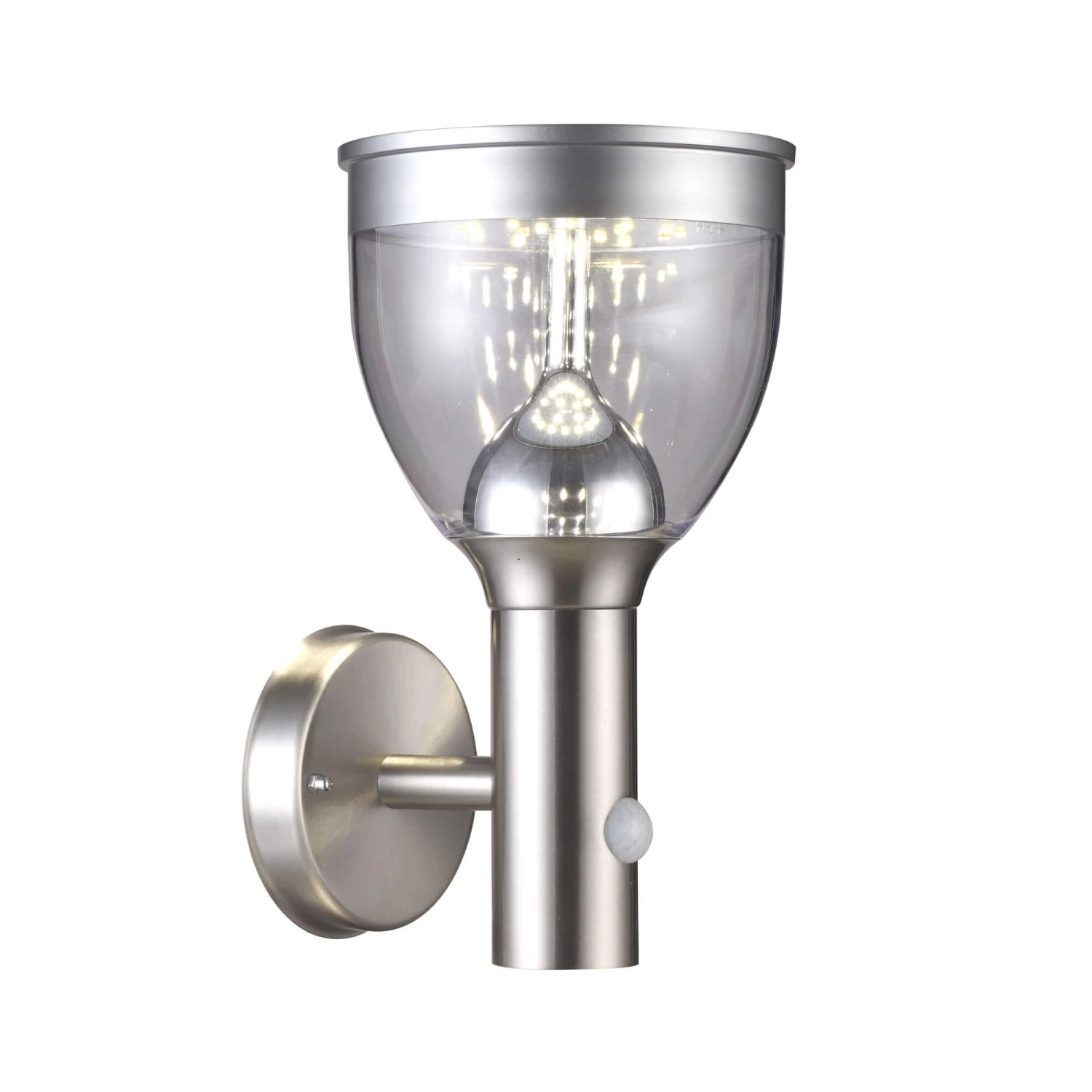 Add a radiant light into the darkness of your outdoors with this Solar Steel Motion Sensor LED Outdoor Wall Lamp. Illuminated by LED light sources, this impressive wall lamp features a clear plastic shade with a steel silver stainless steel top and base. Operated by an integrated motion detector sensor able to react at a distance of 2-6m and detect a radius of up to 90°, this practical outdoor wall lamp is included with 1 x CR18650 battery and has two stages, a permanent light and the second stage with a higher light intensity that only becomes active when moving. Providing a brilliant yet stylish lighting, it is perfect used outdoors or at the entrance of your home.