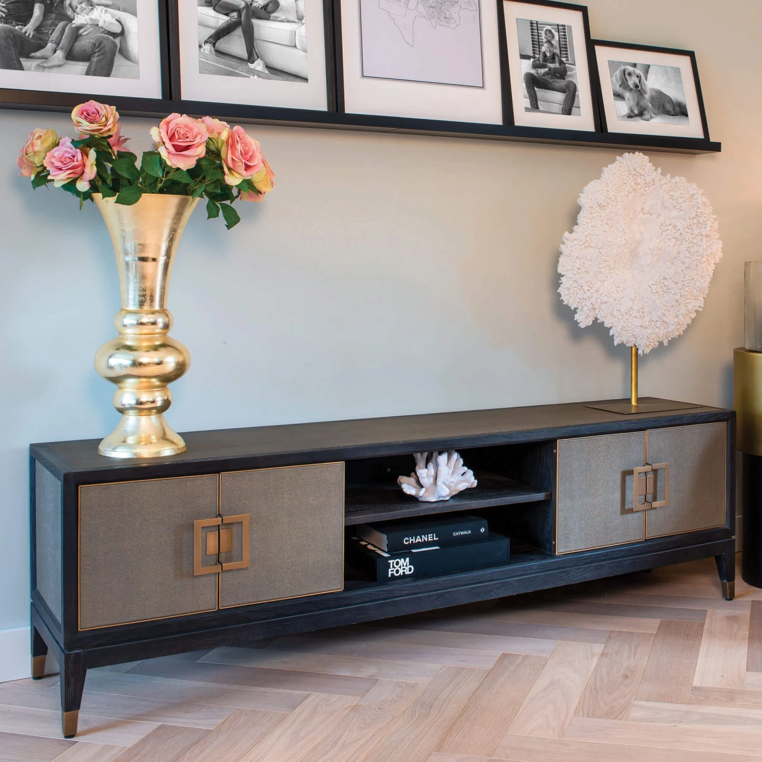 Featuring 2 2 door cupboards and 2 central recesses, the Stellar TV Unit also provides ample storage space for all your consoles and audio visual equipment. Accompanied with its old oak frame in a black finish, the Stellar Shagreen TV Unit is a true statement piece and is sure to bring an air of luxury and refinement to your living area with its bold, opulent design.