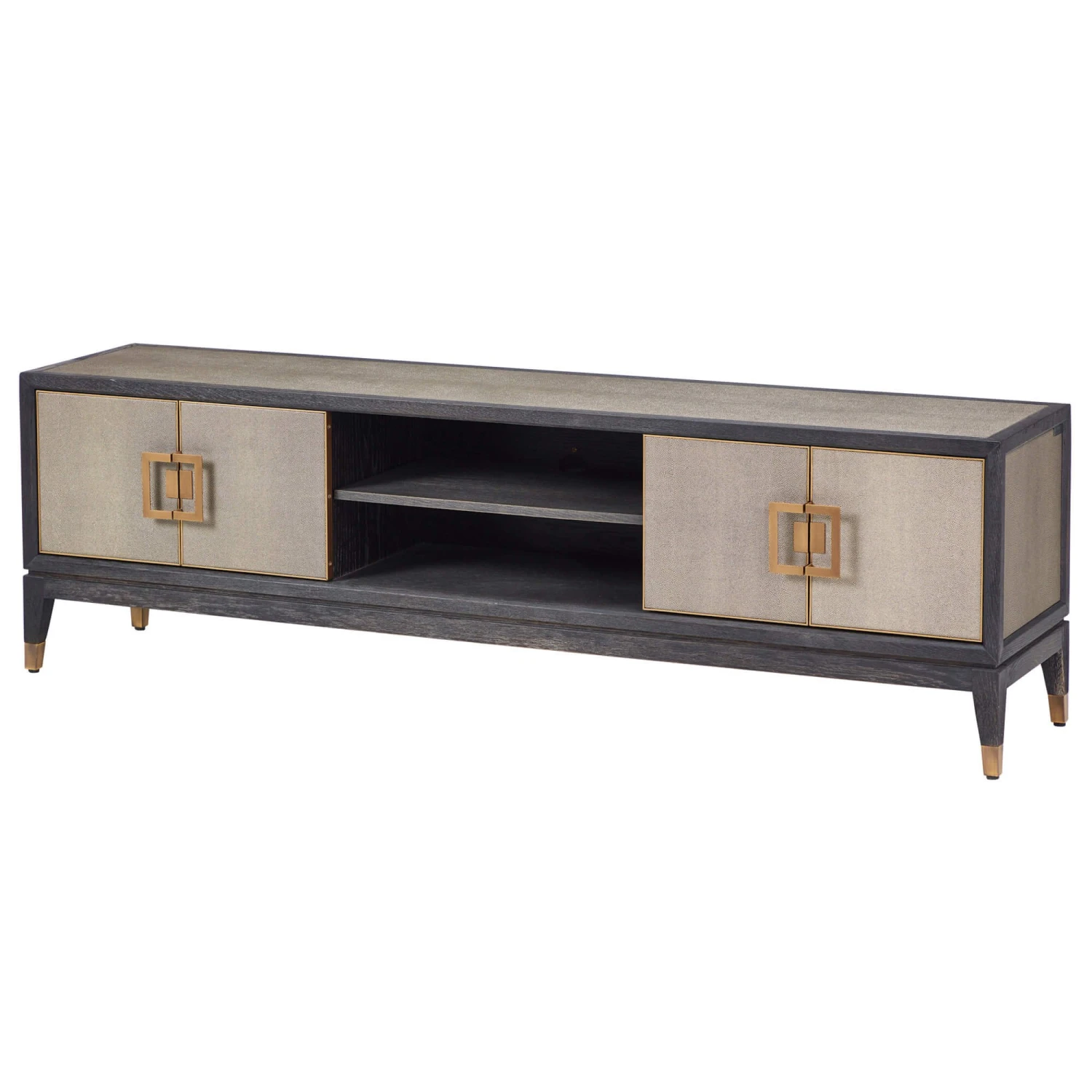 Designed for those who love to make a stylish statement, the Stellar 4 Door Grey Shagreen TV Unit is perfect for bringing the indulgent, free spirit of the roaring 20s to your home. With its decadent matte gold trims and ferrules, statement geometric handles and grey shagreen look fabric that graces the sides and doors, the Stellar boasts a classic, art deco inspired design.