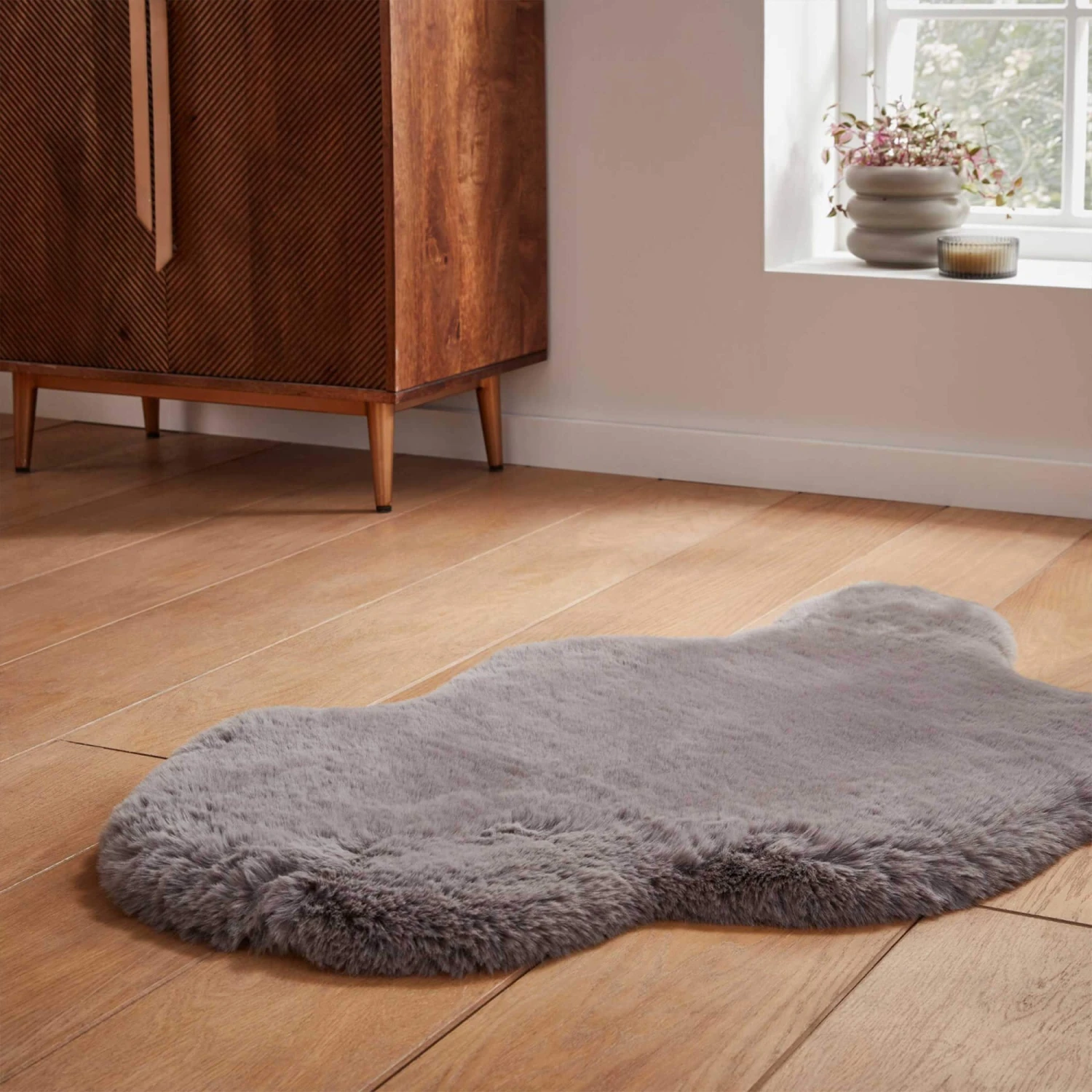This soft, shaggy, sheepskin rug is perfect for sinking your feet into after a long day. The high-quality polyester provides you with a wonderful shine, and a luxurious feel. The grey rug is the ideal choice for any room, whether it compliments a room or the rug is your focal point, it blends in seamlessly with your existing décor.