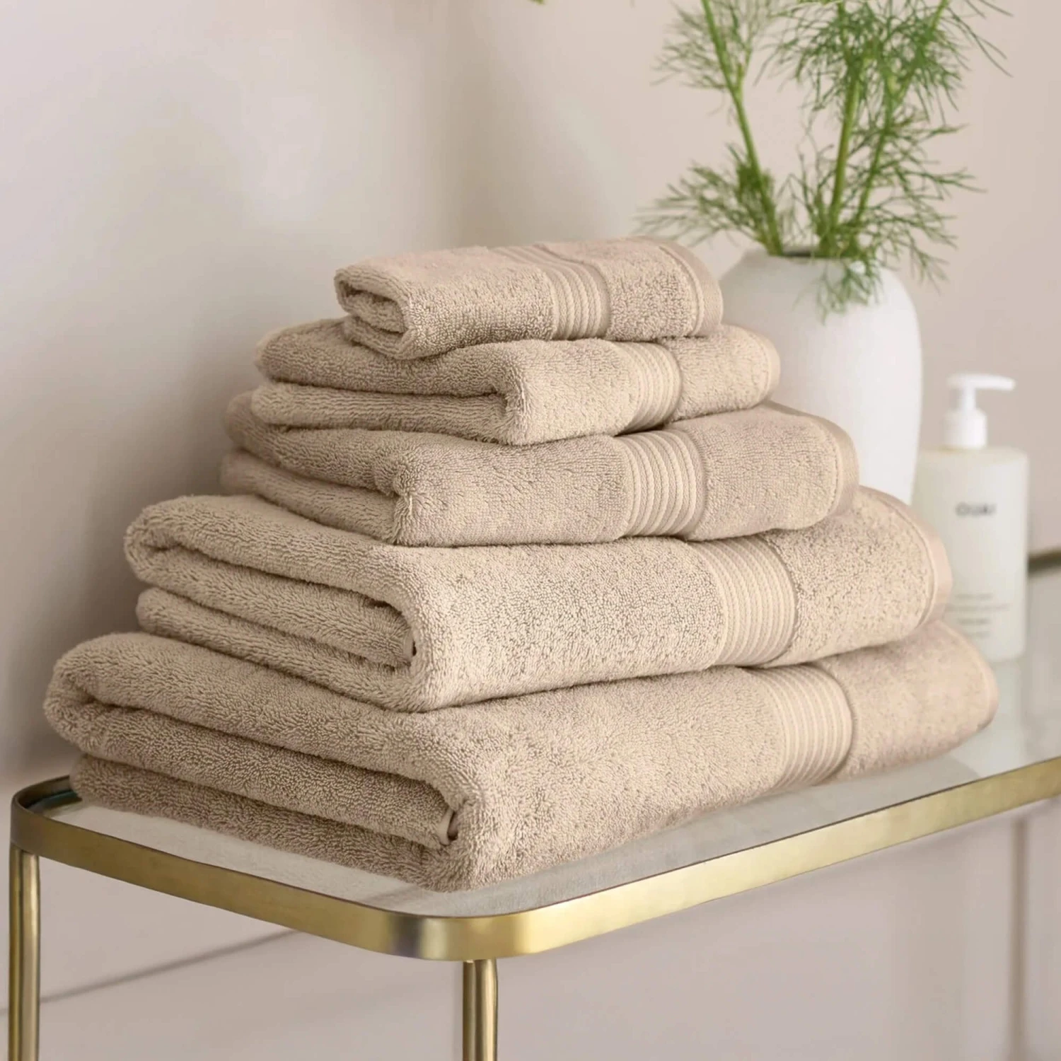 A beige, stone coloured face cloth made from a thick, soft cotton that makes it super absorbent. The towel features a textured stripe that runs through the towel adding a contemporary look.