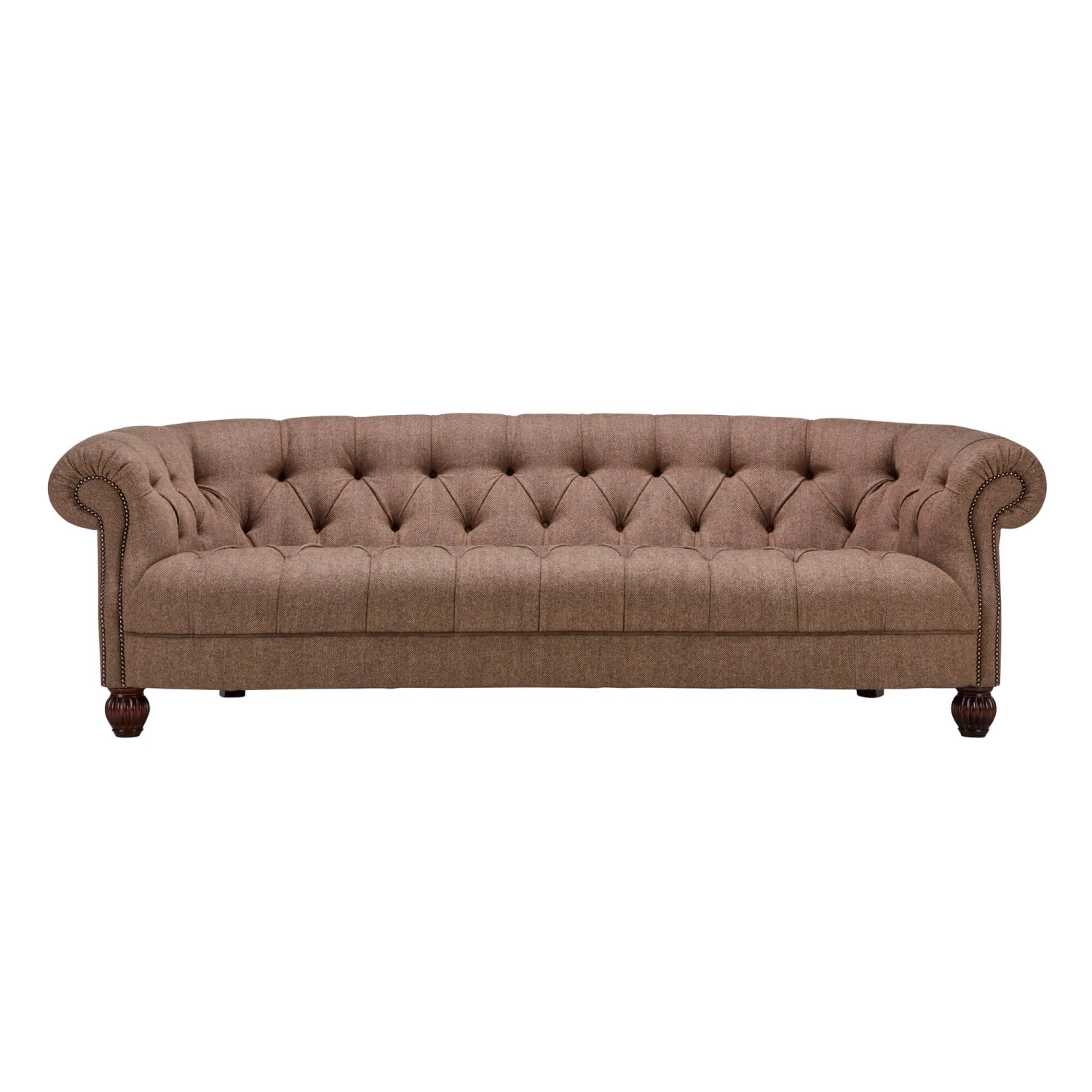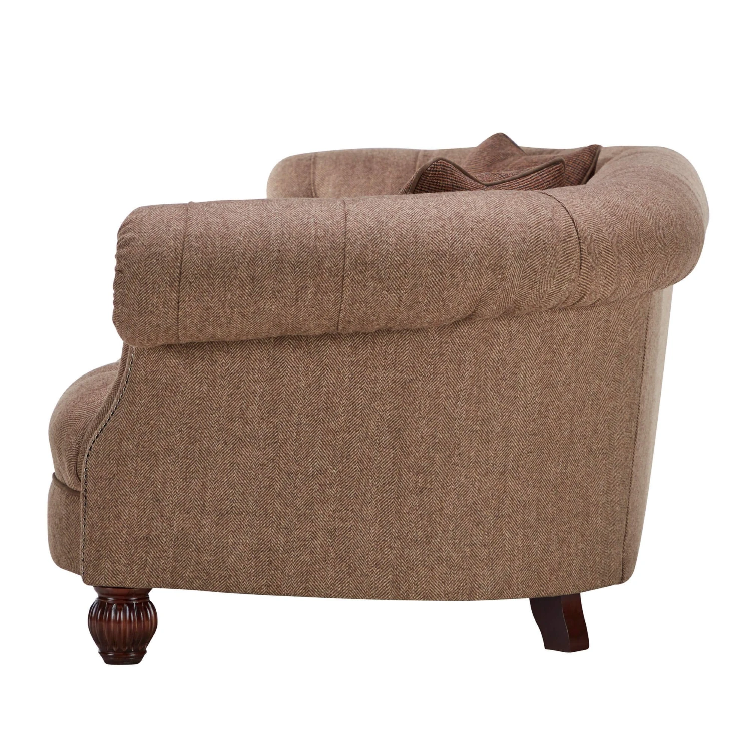 Uniting enduring design and exceptional comfort, the Tetrad Caledonian Brown Tweed Herringbone Fabric Midi Sofa will add a sophisticated statement to any living space. Upholstered in a luxurious brown tweed fabric, woven in a captivating chevron pattern, the Caledonian Sofa offers a stylish take on a timeless classic. Deep valueed detailing, plush fillings and intricate chunky round wooden feet elevate this sofa into a statement piece that commands attention, whilst rows of polished studs along the arms and base add a touch of tradition and complement the rich tones of the tweed fabric. Two luxurious feather-filled scatter cushions in a complementing fabric complete the look.