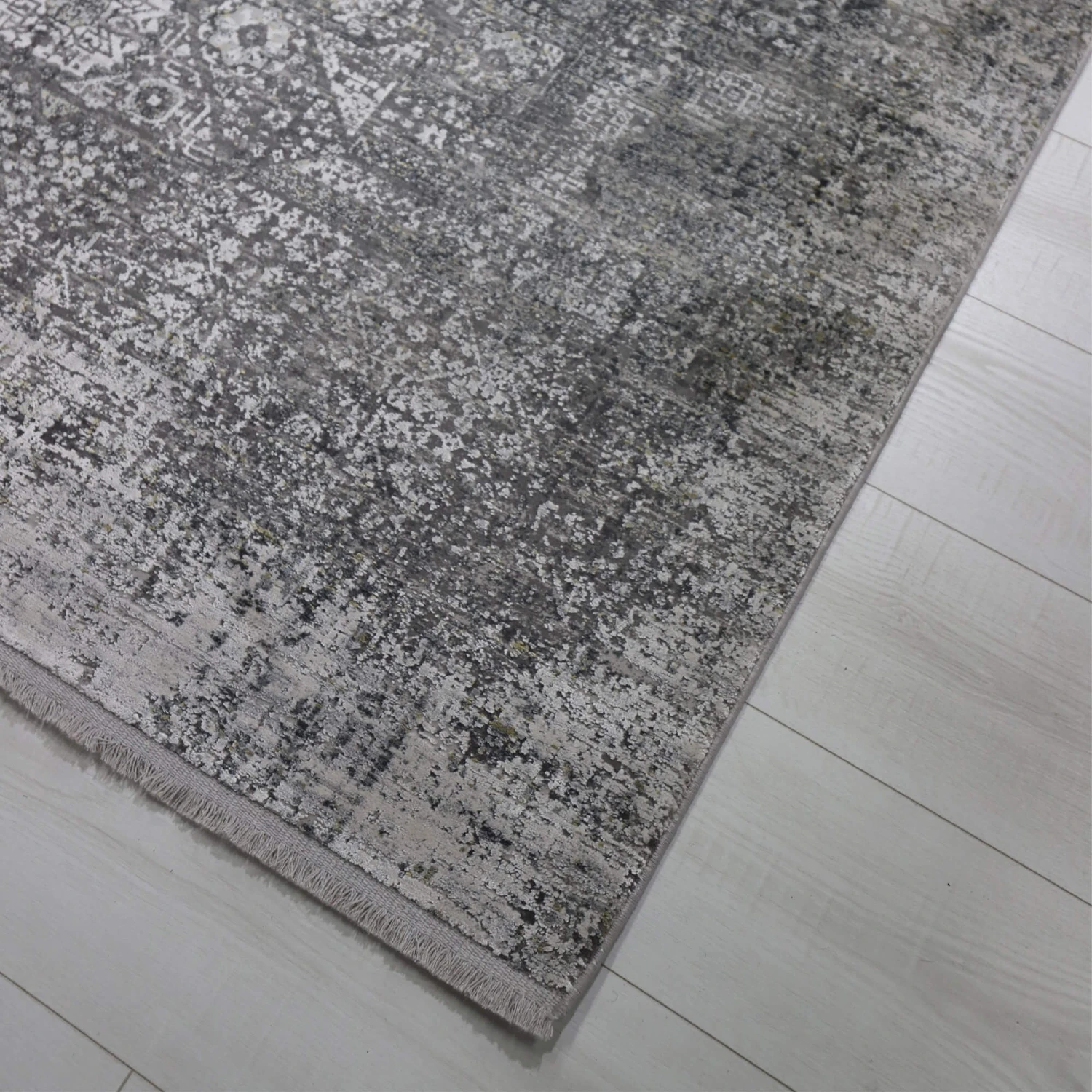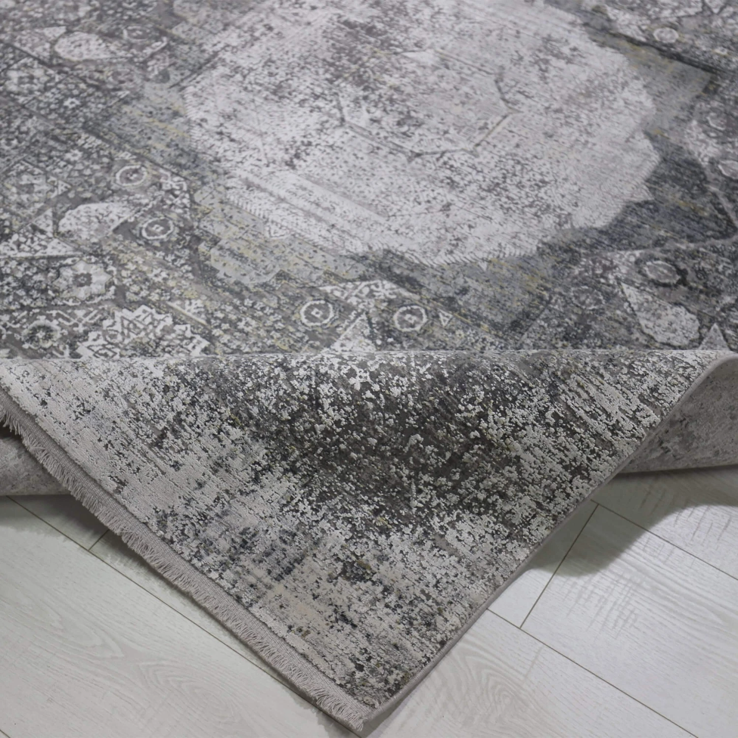 This captivating rug collection features rugs with a a central floral medallion that seamlessly blends shades of grey that create visual depth and interest amongst the rug. The rugs have a distressed vintage look reflects expert artistry, with ageless design and gives your room the feeling quiet sophistication.