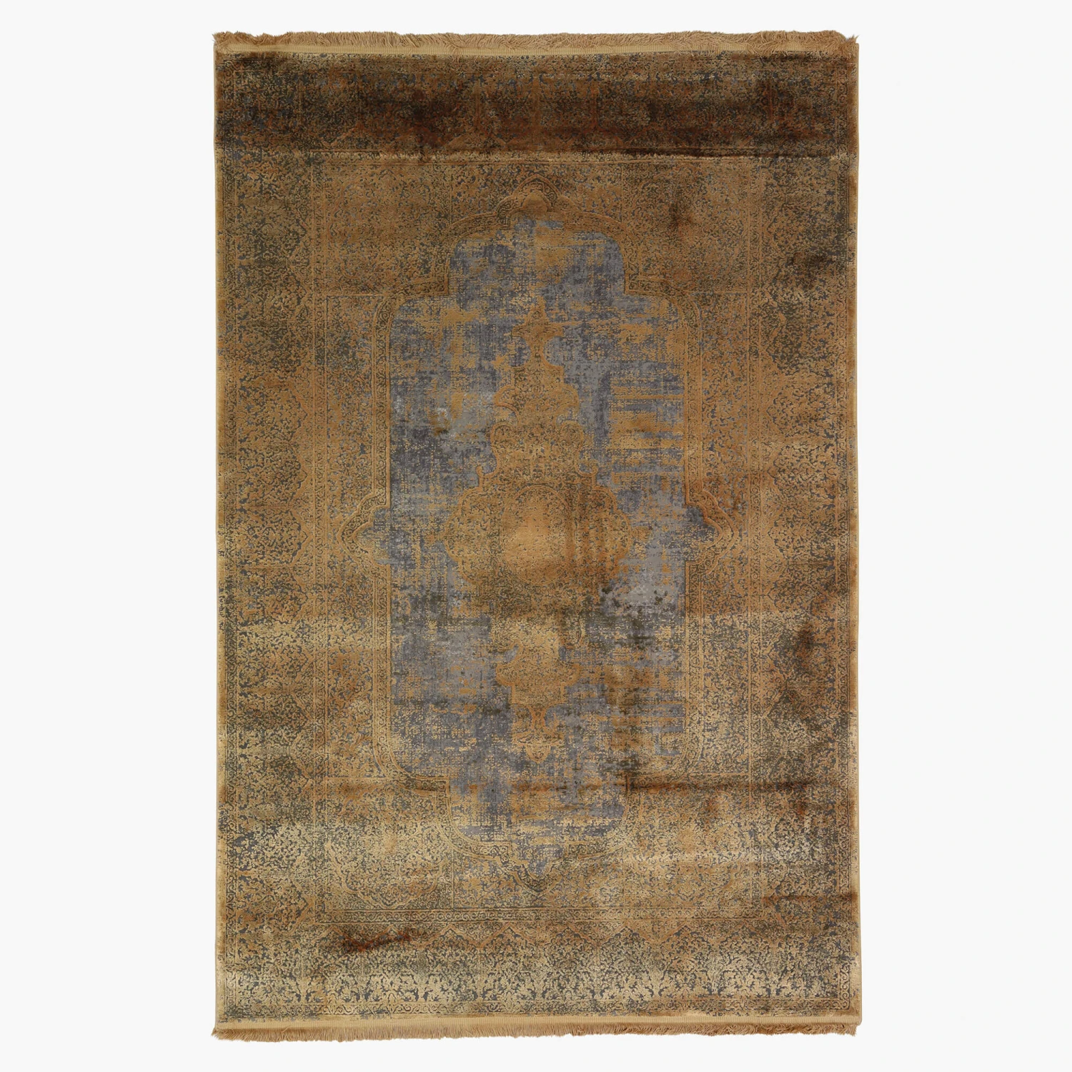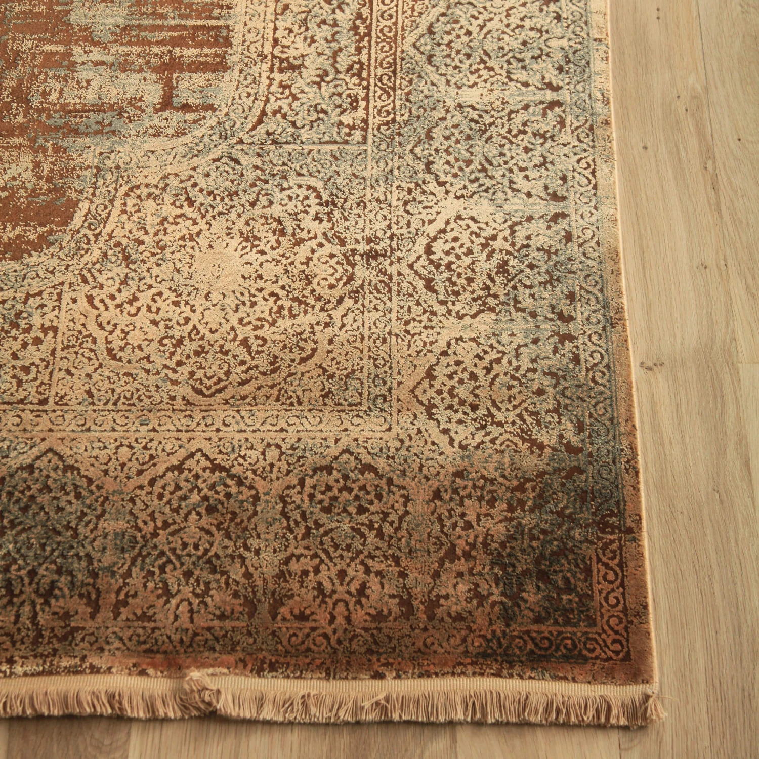 A stunning rug that radiates opulence with its traditional features and its old, distressed look. The rugs medallion design in a copper colourway gives the feeling of sophistication.