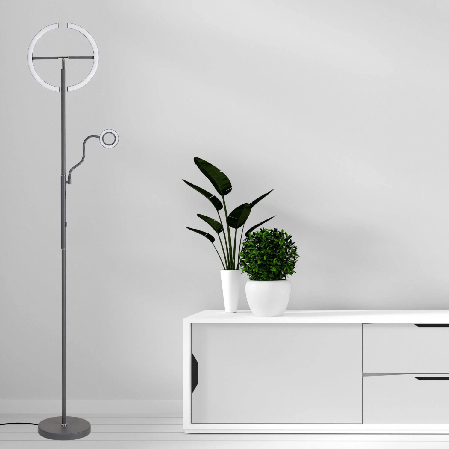 Add a sophisticated and modernised touch to your home with this Vague Dark Grey Uplighter & Reading Light Floor Lamp. Illuminated by two integral LED bulbs, this contemporary floor lamp features two adjustable light sources on a slim stem leading to a main LED uplighter head, with a small halo LED in a form of a reading light sprouting from the centre of the fitting in a dark grey finish. Operated by a touch dimmer or remote control, it allows for easy and convenient adjustment for the brightness or colour temperature of the lamp. Available in two colours; black and dark grey, this versatile and minimalist floor lamp is perfect for illuminating your living room or office.