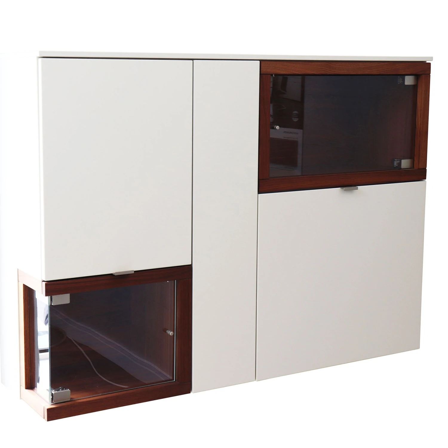 The Andiamo Hanging Cabinet is beautifully finished in a contemporary White Lacquer with contrasting Colorado Walnut accents. The unit features two inset nooks with glass doors for you to display decorative pieces, whilst the large cupboard spaces provide plenty of storage for books, magazines, DVD’s or consoles. The cabinet also includes two extension cables and a transformer for convenience and ease of use