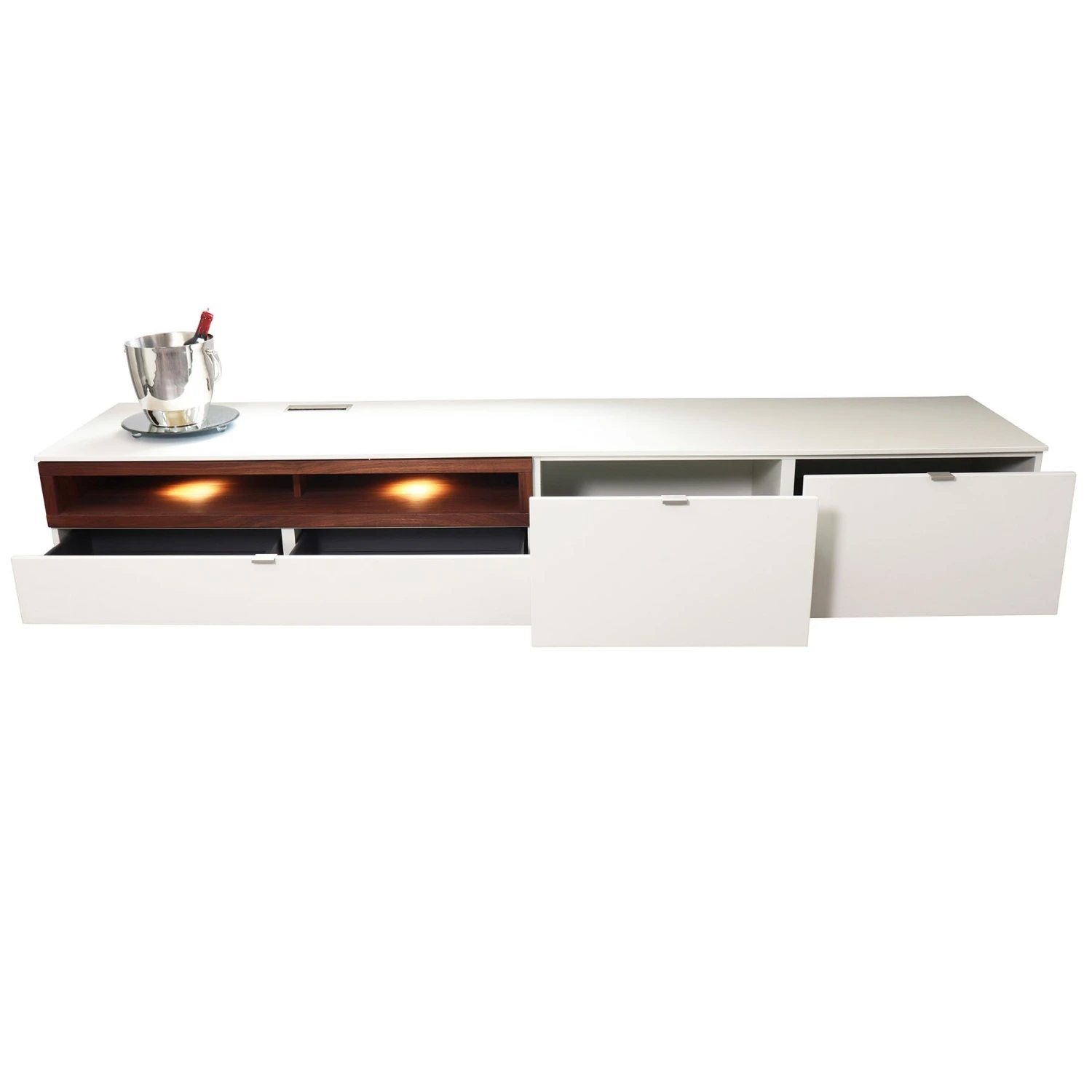 The Andiamo TV Lowboard is beautifully finished in a contemporary White Lacquer with contrasting Colorado Walnut accents. The unit features an inset open shelf for you to display decorative pieces, illuminated by LED lighting, whilst the large pull out drawers provide plenty of storage for books, magazines, DVD’s or consoles. The top of the lowboard also has a convenient cable flap for ease of use