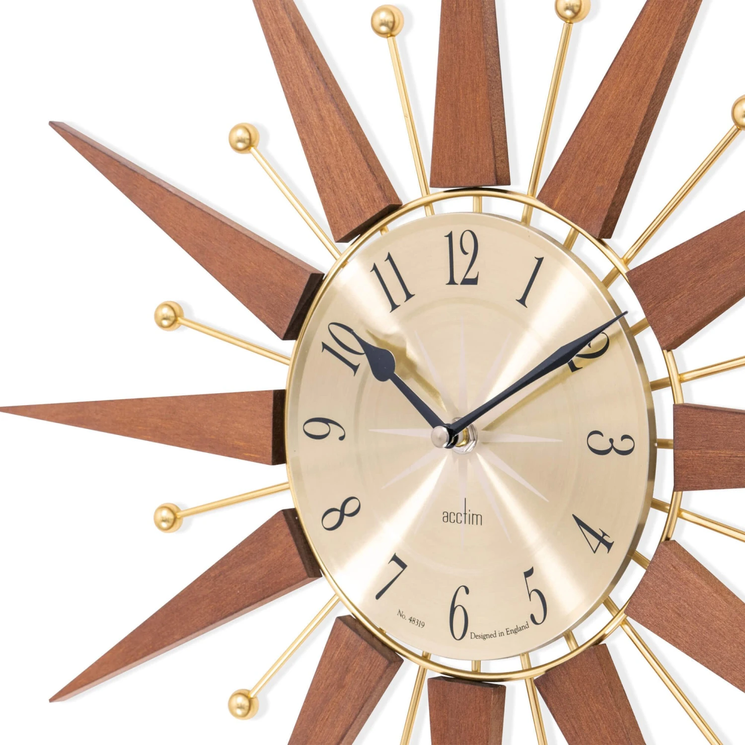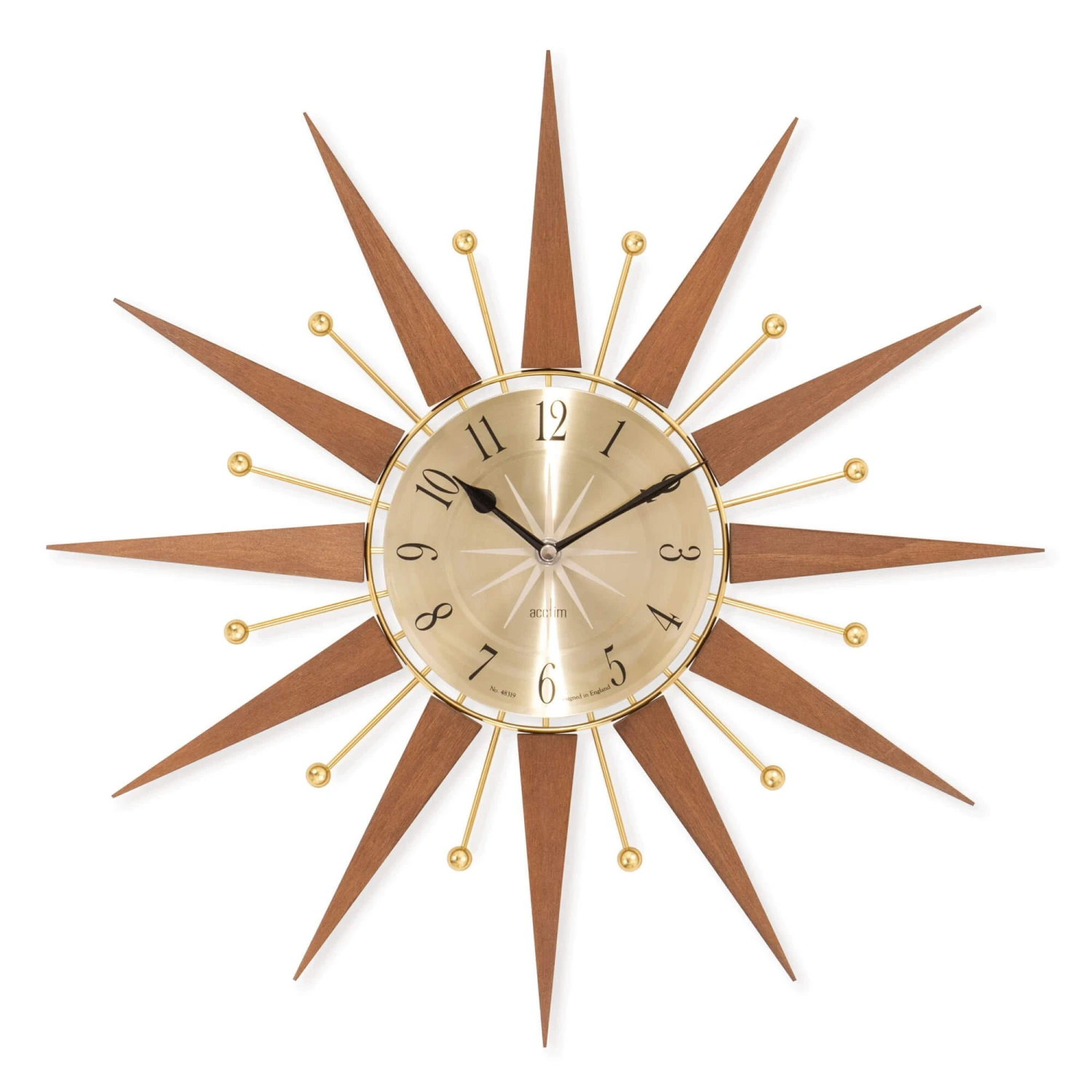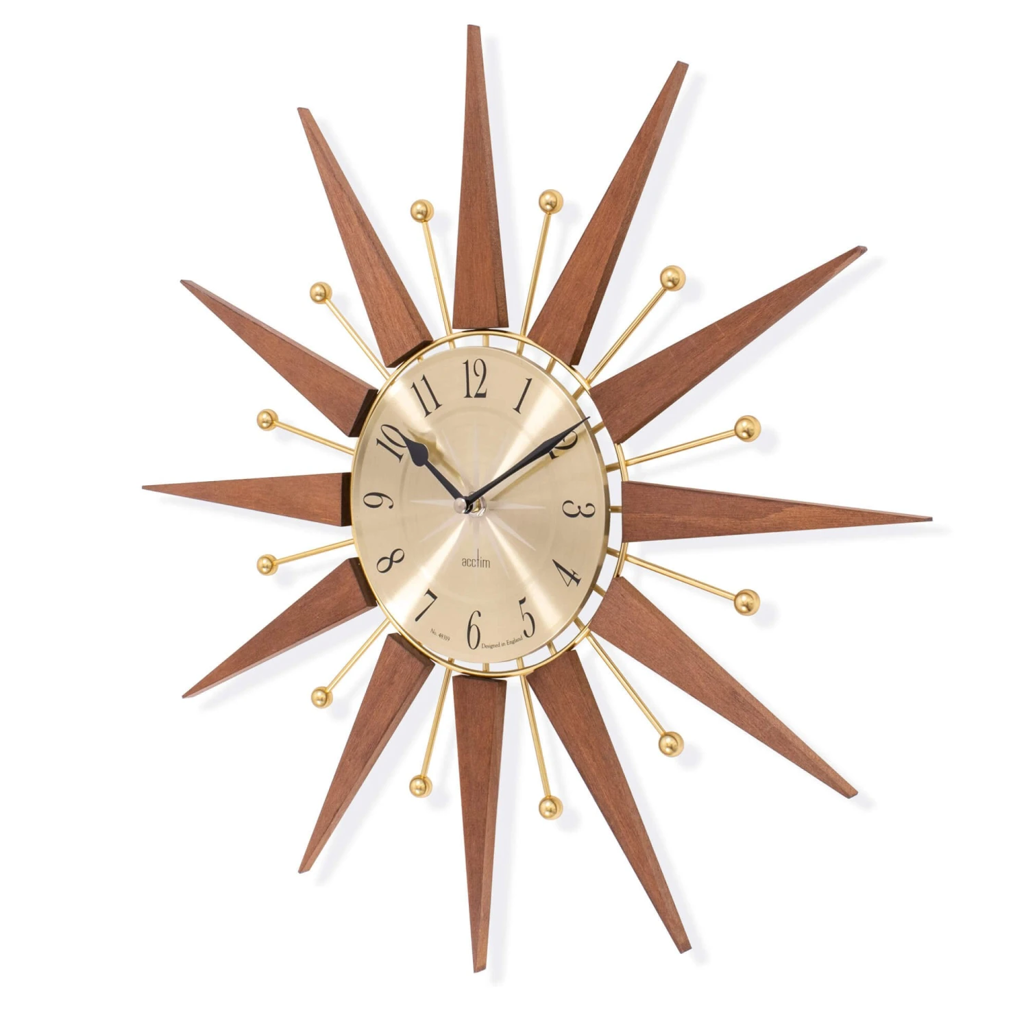 Embrace the iconic aesthetic of the mid-century design movement with this stunning Wolcott Walnut & Brass Starburst Wall Clock. This timepiece is a beautiful fusion of natural materials and elegant metallics, perfect for adding a touch of vintage flair to any living space. The design features a central clock with a brass-coloured face, encased by a striking starburst of triangular walnut wood rays. These wooden elements are complemented by delicate brass-coloured rods, each topped with a spherical accent, creating a dynamic and eye-catching silhouette. The black spade-shaped clock hands provide a bold contrast against the warm golden hue of the clock face, ensuring easy readability.