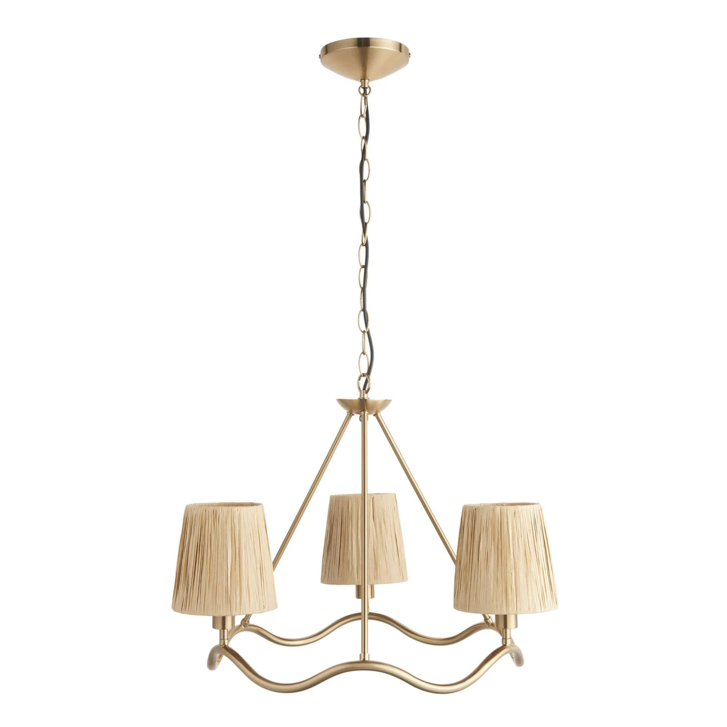 The Wriggle Aged Brass 3 Light Pendant With Raffia Shades is a modern take on country luxe design. Illuminable by three E14 LED bulbs, this charming pendant light features three hand wrapped natural raffia tapered shades with a waved shaped hoop frame and round base in an aged brass plated finish, diffusing a soft light to provide a warm and cosy ambience. Adjustable in height from 52cm to 100cm, it is conveniently dimmable while its wriggle shape metalwork body showcases a ‘wrought’ iron look to create a unique yet stylish statement. Available in two colours, this sophisticated pendant light is perfect for adding a touch of quirkiness and character to any rustic or contemporary décor, making it ideal placed in your living room or bedroom.