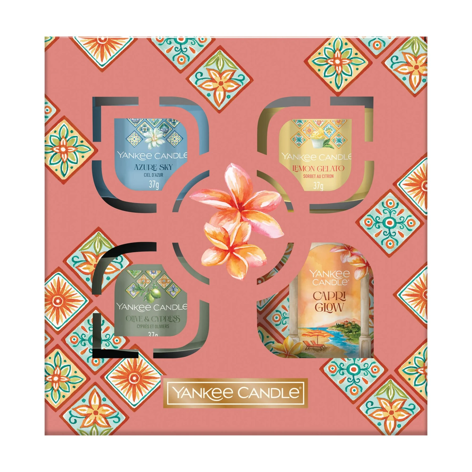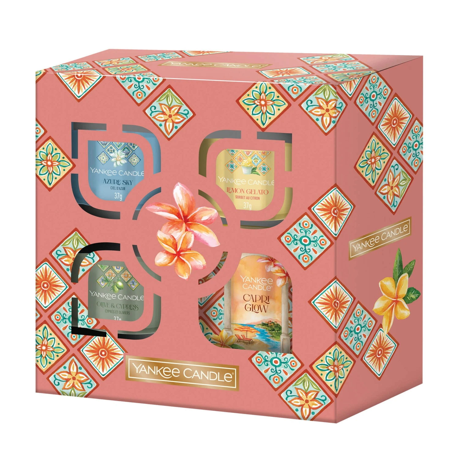 A vibrant gift set that features 3 votive candles with the scent of Azure Sky, Lemon Gelato along with Olive & Cypress. Each of these scents were inspired by the warm culture of Italy. Alongside the votive candles is a tall Capri Glow scented tumbler candle. With a variety of scents and colours, its the ideal gift for a range of events and occasions.